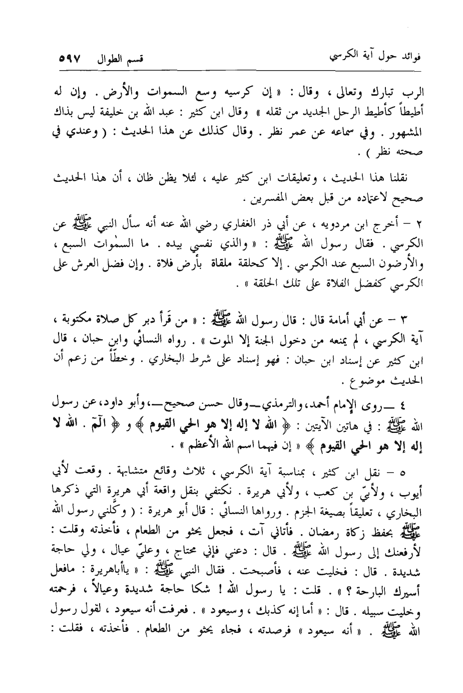 3 - عن أبي أمامة قال: قال رسول الله صلى الله عليه وسلم: «من قرأ دبر كل صلاة مكتوبة، آية الكرسي، لم يمنعه من دخول الجنة إلا الموت». رواه النسائي وابن حبان، قال ابن كثير عن إسناد ابن حبان: فهو إسناد على شرط البخاري. وخطأ من زعم أن الحديث موضوع.