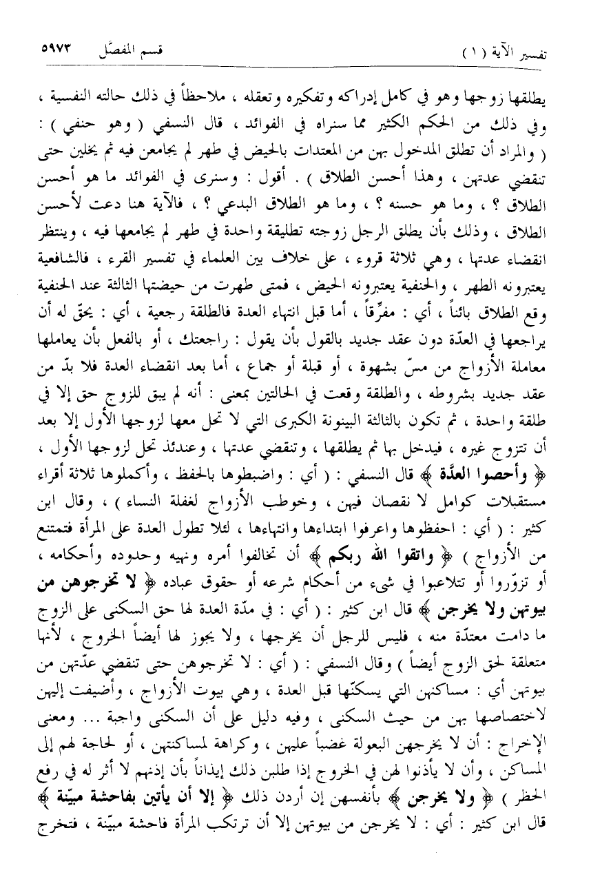 (والمراد أن تطلق المدخول بهن من المعتدات بالحيض في طهر لم يجامعن فيه ثم يخلين حتى تنقضي عدتهن، وهذا أحسن الطلاق). أقول: وسنرى في الفوائد ما هو أحسن الطلاق؟، وما هو حسنه؟، وما هو الطلاق البدعي؟، فالآية هنا دعت لأحسن الطلاق، وذلك بأن يطلق الرجل زوجته تطليقة واحدة في طهر لم يجامعها فيه، وينتظر انقضاء عدتها، وهي ثلاثة قروء، على خلاف بين العلماء في تفسير القرء، فالشافعية يعتبرونه الطهر، والحنفية يعتبرونه الحيض، فمتى طهرت من حيضتها الثالثة عند الحنفية وقع الطلاق بائنا، أي: مفرقا، أما قبل انتهاء العدة فالطلقة رجعية، أي: يحق له أن يراجعها في العدة دون عقد جديد بالقول بأن يقول: راجعتك، أو بالفعل بأن يعاملها معاملة الأزواج من مس بشهوة، أو قبلة أو جماع، أما بعد انقضاء العدة فلا بد من عقد جديد بشروطه، والطلقة وقعت في الحالتين بمعنى: أنه لم يبق للزوج حق إلا في طلقة واحدة، ثم تكون بالثالثة البينونة الكبرى التي لا تحل معها لزوجها الأول إلا بعد أن تتزوج غيره، فيدخل بها ثم يطلقها، وتنقضي عدتها، وعندئذ تحل لزوجها الأول، وَأَحْصُوا الْعِدَّةَ قال النسفي: (أي: واضبطوها بالحفظ، وأكملوها ثلاثة أقراء مستقبلات كوامل لا نقصان فيهن، وخوطب الأزواج لغفلة النساء)، وقال ابن كثير: (أي: احفظوها واعرفوا ابتداءها وانتهاءها، لئلا تطول العدة على المرأة فتمتنع من الأزواج) وَاتَّقُوا اللَّهَ رَبَّكُمْ أن تخالفوا أمره ونهيه وحدوده وأحكامه، أو تزوروا أو تتلاعبوا في شئ من أحكام شرعه أو حقوق عباده لا تُخْرِجُوهُنَّ مِنْ بُيُوتِهِنَّ وَلا يَخْرُجْنَ قال ابن كثير: (أي: في مدة العدة لها حق السكنى على الزوج ما دامت معتدة منه، فليس للرجل أن يخرجها، ولا يجوز لها أيضا الخروج، لأنها متعلقة لحق الزوج أيضا) وقال النسفي: (أي: لا تخرجوهن حتى تنقضي عدتهن من بيوتهن أي: مساكنهن التي يسكنها قبل العدة، وهي بيوت الأزواج، وأضيفت إليهن لاختصاصها بهن من حيث السكنى، وفيه دليل على أن السكنى واجبة ... ومعنى الإخراج: أن لا يخرجهن البعولة غضبا عليهن، وكراهة لمساكنتهن، أو لحاجة لهم إلى المساكن، وأن لا يأذنوا لهن في الخروج إذا طلبن ذلك إيذانا بأن إذنهم لا أثر له في رفع الحظر) وَلا يَخْرُجْنَ بأنفسهن إن أردن ذلك إِلَّا أَنْ يَأْتِينَ بِفاحِشَةٍ مُبَيِّنَةٍ قال ابن كثير: أي: لا يخرجن من بيوتهن إلا أن ترتكب المرأة فاحشة مبينة، فتخرج