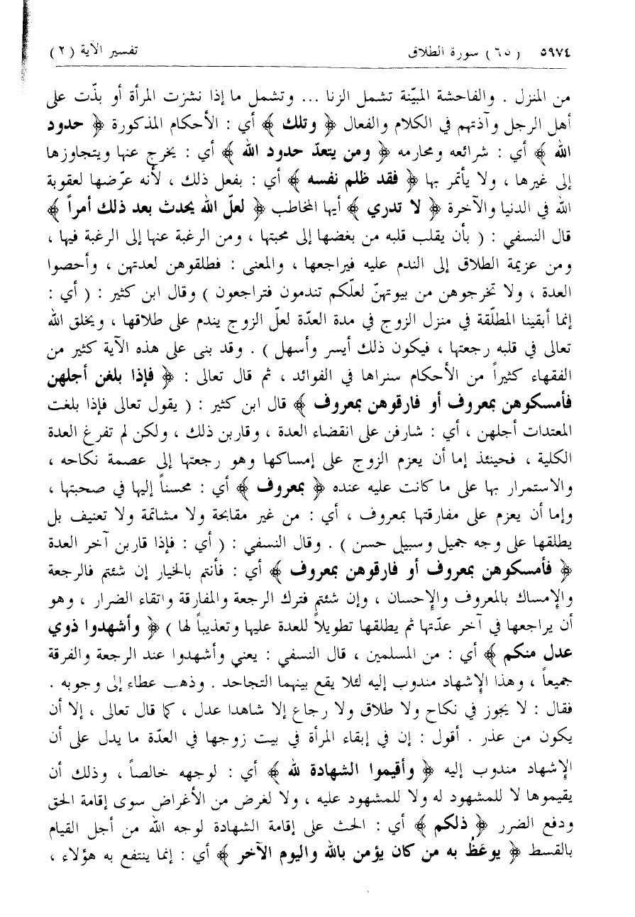 ثم قال تعالى: فَإِذا بَلَغْنَ أَجَلَهُنَّ فَأَمْسِكُوهُنَّ بِمَعْرُوفٍ أَوْ فارِقُوهُنَّ بِمَعْرُوفٍ قال ابن كثير: (يقول تعالى فإذا بلغت المعتدات أجلهن، أي: شارفن على انقضاء العدة، وقاربن ذلك، ولكن لم تفرغ العدة الكلية، فحينئذ إما أن يعزم الزوج على إمساكها وهو رجعتها إلى عصمة نكاحه، والاستمرار بها على ما كانت عليه عنده بِمَعْرُوفٍ أي: محسنا إليها في صحبتها، وإما أن يعزم على مفارقتها بمعروف، أي: من غير مقابحة ولا مشاتمة ولا تعنيف بل يطلقها على وجه جميل وسبيل حسن). وقال النسفي: (أي: فإذا قاربن آخر العدة فَأَمْسِكُوهُنَّ بِمَعْرُوفٍ أَوْ فارِقُوهُنَّ بِمَعْرُوفٍ أي: فأنتم بالخيار إن شئتم فالرجعة والإمساك بالمعروف والإحسان، وإن شئتم فترك الرجعة والمفارقة واتقاء الضرار، وهو أن يراجعها في آخر عدتها ثم يطلقها تطويلا للعدة عليها وتعذيبا لها) وَأَشْهِدُوا ذَوَيْ عَدْلٍ مِنْكُمْ أي: من المسلمين، قال النسفي: يعني وأشهدوا عند الرجعة والفرقة جميعا، وهذا الإشهاد مندوب إليه لئلا يقع بينهما التجاحد. وذهب عطاء إلى وجوبه.