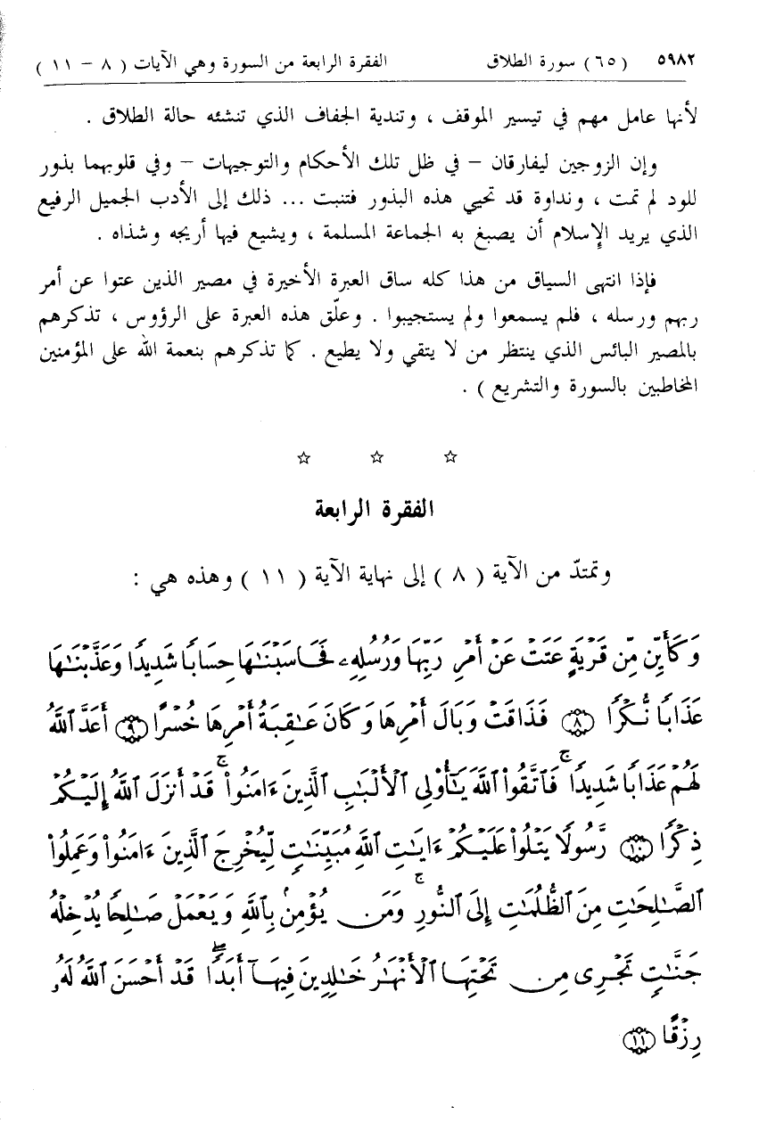 فإذا انتهى السياق من هذا كله ساق العبرة الأخيرة في مصير الذين عتوا عن أمر ربهم ورسله، فلم يسمعوا ولم يستجيبوا. وعلق هذه العبرة على الرءوس، تذكرهم بالمصير البائس الذي ينتظر من لا يتقي ولا يطيع. كما تذكرهم بنعمة الله على المؤمنين المخاطبين بالسورة والتشريع).