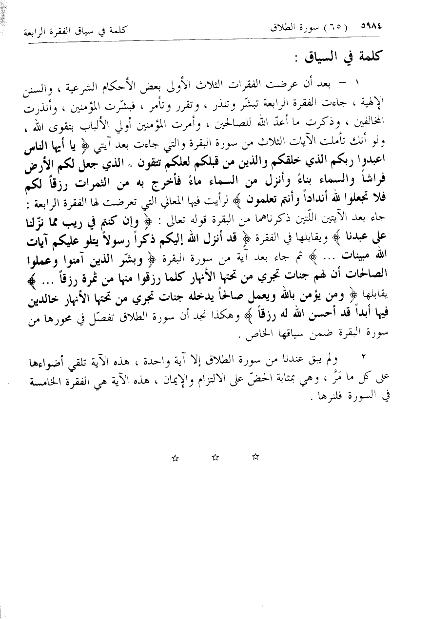 2 - ولم يبق عندنا من سورة الطلاق إلا آية واحدة، هذه الآية تلقي أضواءها على كل ما مر، وهي بمثابة الحض على الالتزام والإيمان، هذه الآية هي الفقرة الخامسة في السورة فلنرها.