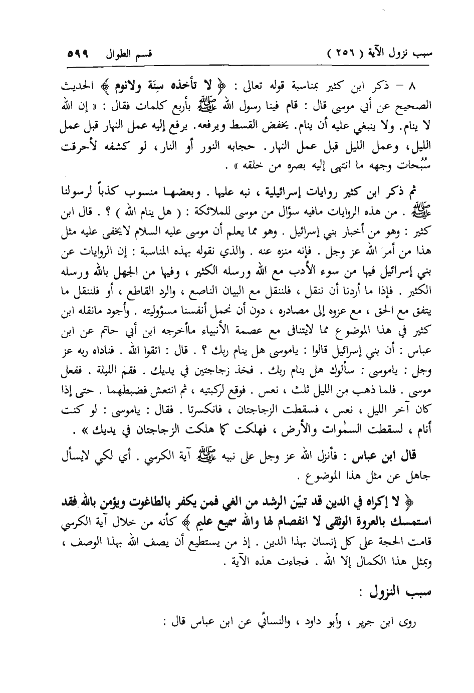 8 - ذكر ابن كثير بمناسبة قوله تعالى: لا تَأْخُذُهُ سِنَةٌ وَلا نَوْمٌ الحديث الصحيح عن أبي موسى قال: قام فينا رسول الله صلى الله عليه وسلم بأربع كلمات فقال: «إن الله لا ينام. ولا ينبغي عليه أن ينام. يخفض القسط ويرفعه. يرفع إليه عمل النهار قبل عمل الليل، وعمل الليل قبل عمل النهار. حجابه النور أو النار، لو كشفه لأحرقت سبحات وجهه ما انتهى إليه بصره من خلقه».