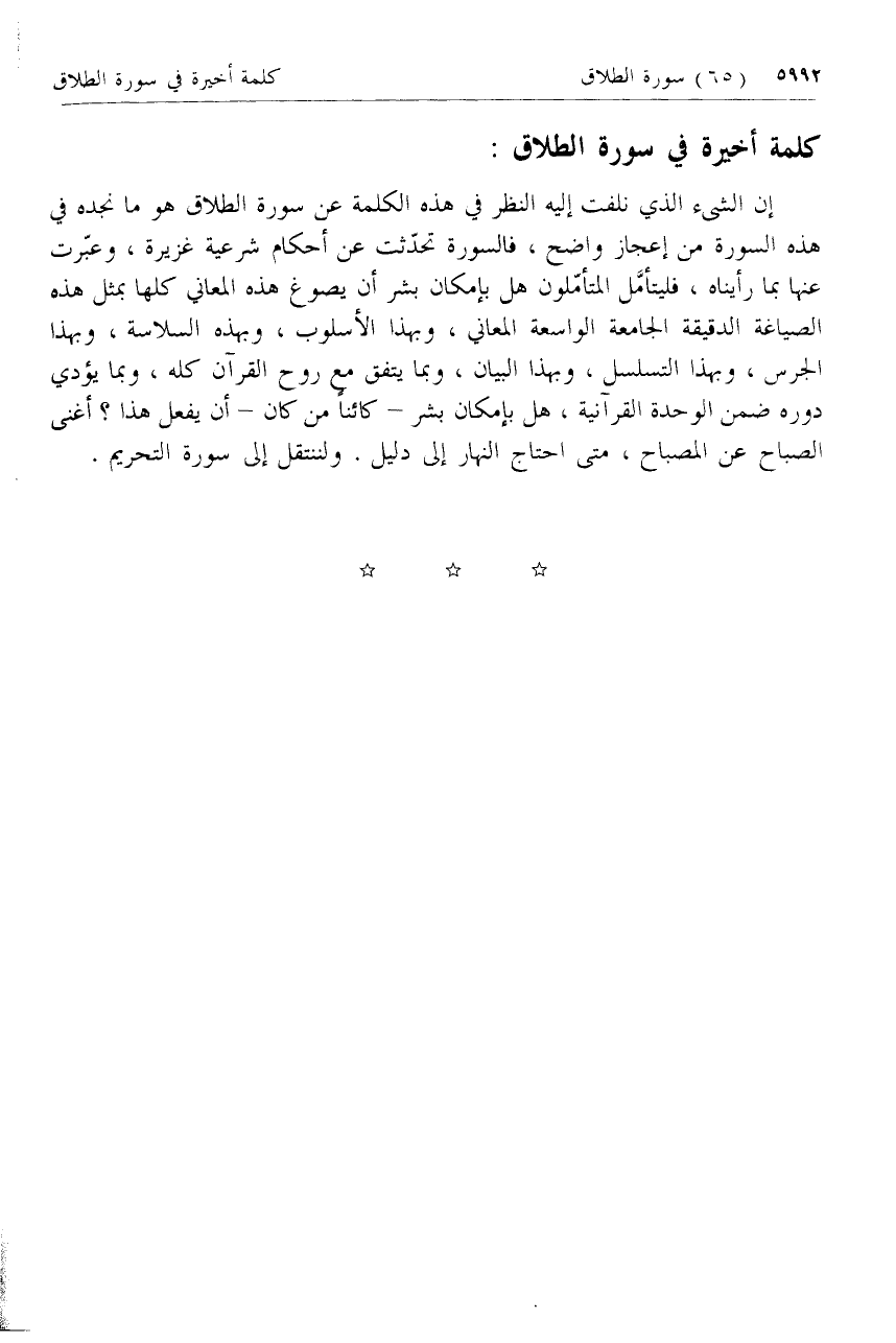 إن الشئ الذي نلفت إليه النظر في هذه الكلمة عن سورة الطلاق هو ما نجده في هذه السورة من إعجاز واضح، فالسورة تحدثت عن أحكام شرعية غزيرة، وعبرت عنها بما رأيناه، فليتأمل المتأملون هل بإمكان بشر أن يصوغ هذه المعاني كلها بمثل هذه الصياغة الدقيقة الجامعة الواسعة المعاني، وبهذا الأسلوب، وبهذه السلاسة، وبهذا الجرس، وبهذا التسلسل، وبهذا البيان، وبما يتفق مع روح القرآن كله، وبما يؤدي دوره ضمن الوحدة القرآنية، هل بإمكان بشر- كائنا من كان- أن يفعل هذا؟ أغنى الصباح عن المصباح، متى احتاج النهار إلى دليل. ولننتقل إلى سورة التحريم.