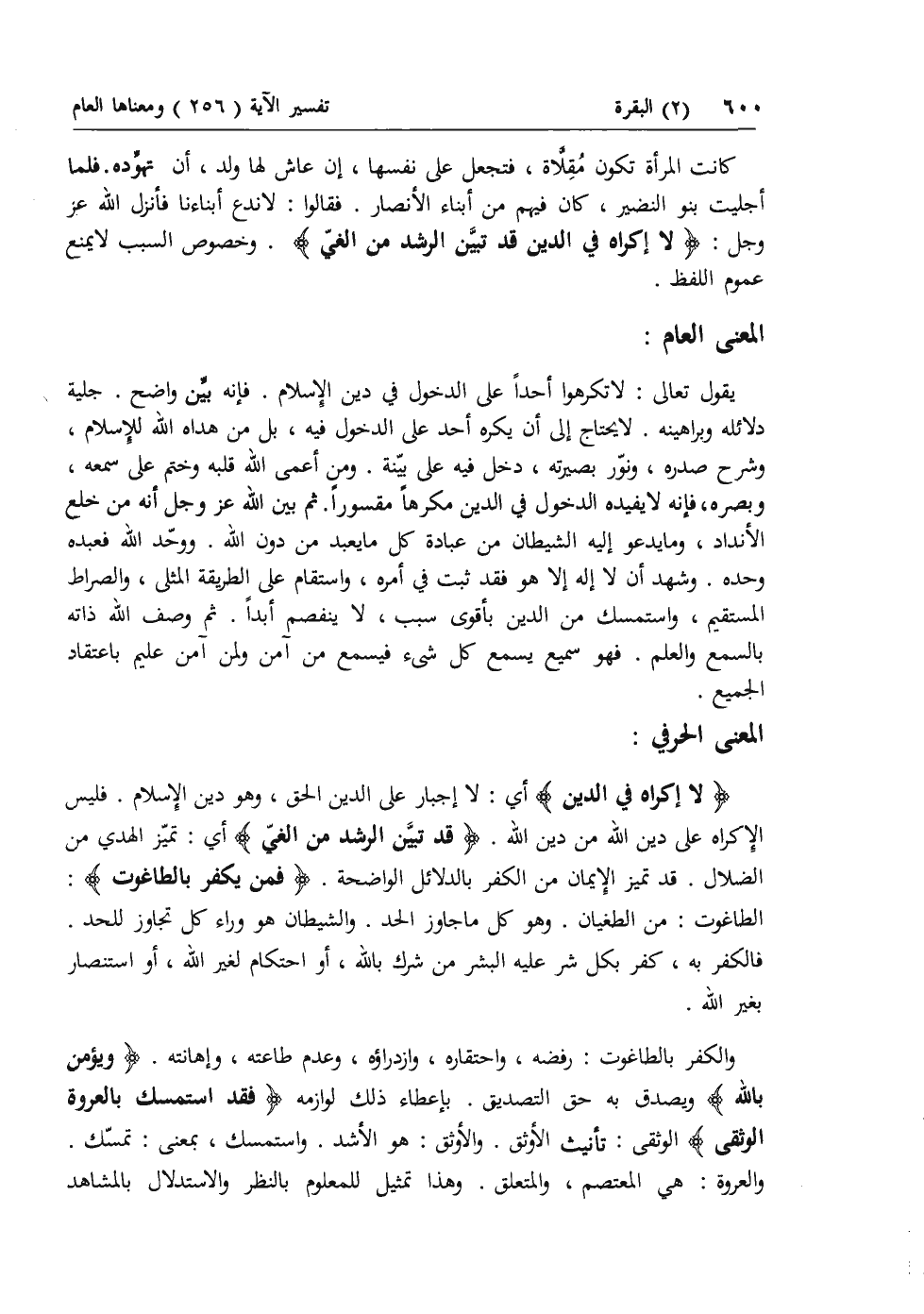 لا إِكْراهَ فِي الدِّينِ أي: لا إجبار على الدين الحق، وهو دين الإسلام. فليس الإكراه على دين الله من دين الله. قَدْ تَبَيَّنَ الرُّشْدُ مِنَ الْغَيِّ أي: تميز الهدي من الضلال. قد تميز الإيمان من الكفر بالدلائل الواضحة. فَمَنْ يَكْفُرْ بِالطَّاغُوتِ: