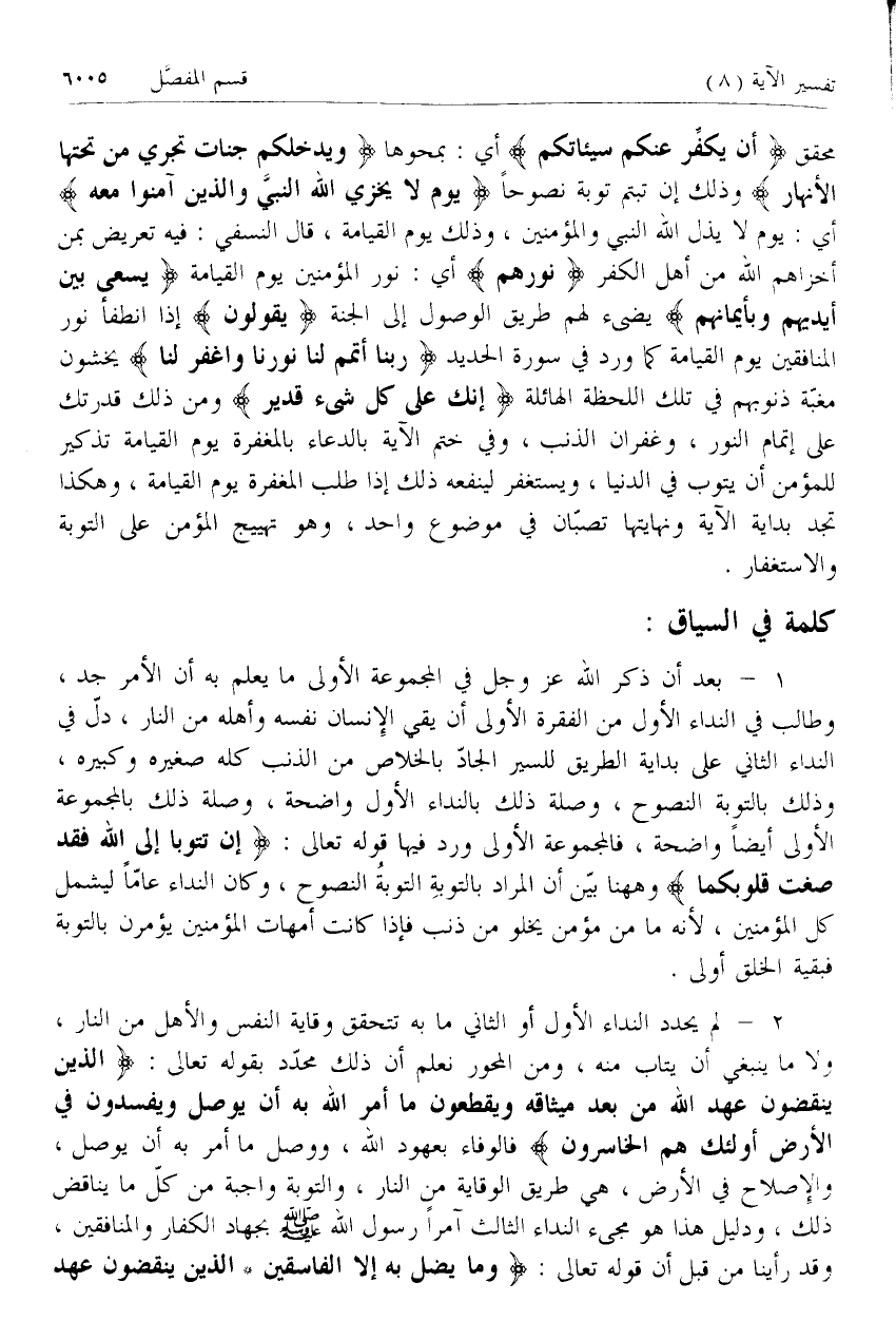 محقق أَنْ يُكَفِّرَ عَنْكُمْ سَيِّئاتِكُمْ أي: بمحوها وَيُدْخِلَكُمْ جَنَّاتٍ تَجْرِي مِنْ تَحْتِهَا الْأَنْهارُ وذلك إن تبتم توبة نصوحا يَوْمَ لا يُخْزِي اللَّهُ النَّبِيَّ وَالَّذِينَ آمَنُوا مَعَهُ أي: يوم لا يذل الله النبي والمؤمنين، وذلك يوم القيامة، قال النسفي: فيه تعريض بمن أخزاهم الله من أهل الكفر نُورُهُمْ أي: نور المؤمنين يوم القيامة يَسْعى بَيْنَ أَيْدِيهِمْ وَبِأَيْمانِهِمْ يضئ لهم طريق الوصول إلى الجنة يَقُولُونَ إذا انطفأ نور المنافقين يوم القيامة كما ورد في سورة الحديد رَبَّنا أَتْمِمْ لَنا نُورَنا وَاغْفِرْ لَنا يخشون مغبة ذنوبهم في تلك اللحظة الهائلة إِنَّكَ عَلى كُلِّ شَيْءٍ قَدِيرٌ ومن ذلك قدرتك على إتمام النور، وغفران الذنب، وفي ختم الآية بالدعاء بالمغفرة يوم القيامة تذكير للمؤمن أن يتوب في الدنيا، ويستغفر لينفعه ذلك إذا طلب المغفرة يوم القيامة، وهكذا تجد بداية الآية ونهايتها تصبان في موضوع واحد، وهو تهييج المؤمن على التوبة والاستغفار.