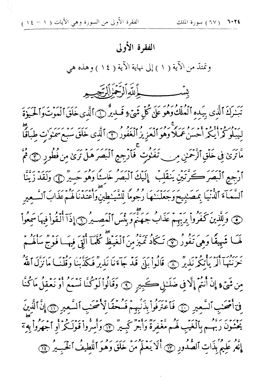تَبارَكَ الَّذِي بِيَدِهِ الْمُلْكُ وَهُوَ عَلى كُلِّ شَيْءٍ قَدِيرٌ (1) الَّذِي خَلَقَ الْمَوْتَ وَالْحَياةَ لِيَبْلُوَكُمْ أَيُّكُمْ أَحْسَنُ عَمَلاً وَهُوَ الْعَزِيزُ الْغَفُورُ (2) الَّذِي خَلَقَ سَبْعَ سَماواتٍ طِباقاً ما تَرى فِي خَلْقِ الرَّحْمنِ مِنْ تَفاوُتٍ فَارْجِعِ الْبَصَرَ هَلْ تَرى مِنْ فُطُورٍ (3) ثُمَّ ارْجِعِ الْبَصَرَ كَرَّتَيْنِ يَنْقَلِبْ إِلَيْكَ الْبَصَرُ خاسِئاً وَهُوَ حَسِيرٌ (4)
