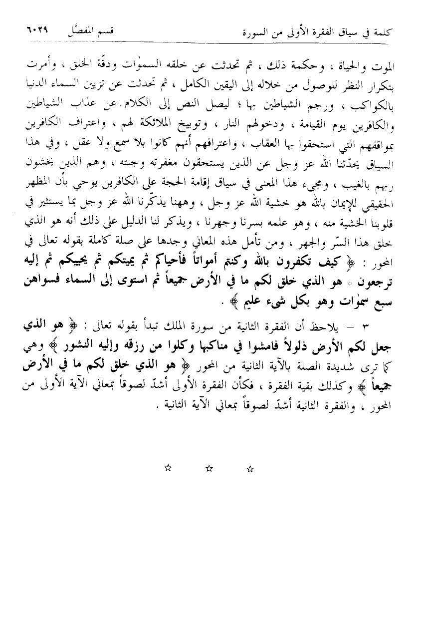 3 - يلاحظ أن الفقرة الثانية من سورة الملك تبدأ بقوله تعالى: هُوَ الَّذِي جَعَلَ لَكُمُ الْأَرْضَ ذَلُولًا فَامْشُوا فِي مَناكِبِها وَكُلُوا مِنْ رِزْقِهِ وَإِلَيْهِ النُّشُورُ وهي كما ترى شديدة الصلة بالآية الثانية من المحور هُوَ الَّذِي خَلَقَ لَكُمْ ما فِي الْأَرْضِ جَمِيعاً وكذلك بقية الفقرة، فكأن الفقرة الأولى أشد لصوقا بمعاني الآية الأولى من المحور، والفقرة الثانية أشد لصوقا بمعاني الآية الثانية.