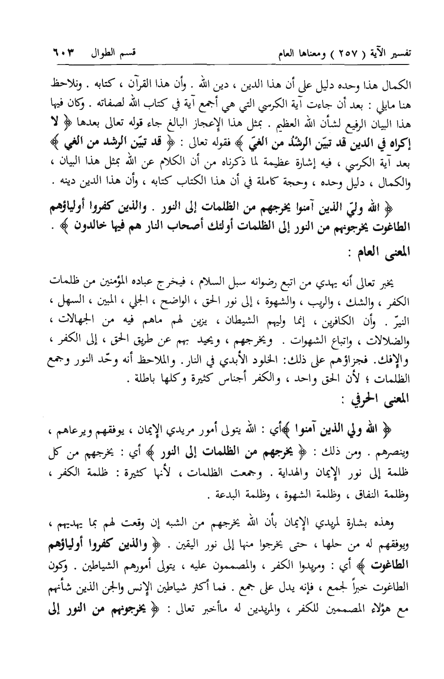 الكمال هذا وحده دليل على أن هذا الدين، دين الله. وأن هذا القرآن، كتابه. ونلاحظ هنا ما يلي: بعد أن جاءت آية الكرسي التي هي أجمع آية في كتاب الله لصفاته. وكان فيها هذا البيان الرفيع لشأن الله العظيم. بمثل هذا الإعجاز البالغ جاء قوله تعالى بعدها لا إِكْراهَ فِي الدِّينِ قَدْ تَبَيَّنَ الرُّشْدُ مِنَ الْغَيِّ فقوله تعالى: قَدْ تَبَيَّنَ الرُّشْدُ مِنَ الْغَيِّ بعد آية الكرسي، فيه إشارة عظيمة لما ذكرناه من أن الكلام عن الله بمثل هذا البيان، والكمال، دليل وحده، وحجة كاملة في أن هذا الكتاب كتابه، وأن هذا الدين دينه.