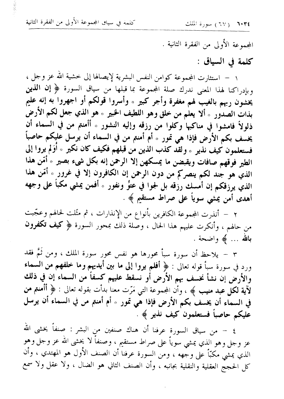 1 - استثارت المجموعة كوامن النفس البشرية لإيصالها إلى خشية الله عزّ وجل، وبإدراكنا لهذا المعنى ندرك صلة المجموعة بما قبلها من سياق السورة إِنَّ الَّذِينَ يَخْشَوْنَ رَبَّهُمْ بِالْغَيْبِ لَهُمْ مَغْفِرَةٌ وَأَجْرٌ كَبِيرٌ* وَأَسِرُّوا قَوْلَكُمْ أَوِ اجْهَرُوا بِهِ إِنَّهُ عَلِيمٌ بِذاتِ الصُّدُورِ* أَلا يَعْلَمُ مَنْ خَلَقَ وَهُوَ اللَّطِيفُ الْخَبِيرُ* هُوَ الَّذِي جَعَلَ لَكُمُ الْأَرْضَ ذَلُولًا فَامْشُوا فِي مَناكِبِها وَكُلُوا مِنْ رِزْقِهِ وَإِلَيْهِ النُّشُورُ* أَأَمِنْتُمْ مَنْ فِي السَّماءِ أَنْ يَخْسِفَ بِكُمُ الْأَرْضَ فَإِذا هِيَ تَمُورُ* أَمْ أَمِنْتُمْ مَنْ فِي السَّماءِ أَنْ يُرْسِلَ عَلَيْكُمْ حاصِباً فَسَتَعْلَمُونَ كَيْفَ نَذِيرِ* وَلَقَدْ كَذَّبَ الَّذِينَ مِنْ قَبْلِهِمْ فَكَيْفَ كانَ نَكِيرِ* أَوَلَمْ يَرَوْا إِلَى الطَّيْرِ فَوْقَهُمْ صافَّاتٍ وَيَقْبِضْنَ ما يُمْسِكُهُنَّ إِلَّا الرَّحْمنُ إِنَّهُ بِكُلِّ شَيْءٍ بَصِيرٌ* أَمَّنْ هذَا الَّذِي هُوَ جُنْدٌ لَكُمْ يَنْصُرُكُمْ مِنْ دُونِ الرَّحْمنِ إِنِ الْكافِرُونَ إِلَّا فِي غُرُورٍ* أَمَّنْ هذَا الَّذِي يَرْزُقُكُمْ إِنْ أَمْسَكَ رِزْقَهُ بَلْ لَجُّوا فِي عُتُوٍّ وَنُفُورٍ* أَفَمَنْ يَمْشِي مُكِبًّا عَلى وَجْهِهِ أَهْدى أَمَّنْ يَمْشِي سَوِيًّا عَلى صِراطٍ مُسْتَقِيمٍ.