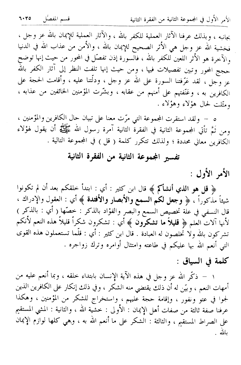 قُلْ هُوَ الَّذِي أَنْشَأَكُمْ قال ابن كثير: أي: ابتدأ خلقكم بعد أن لم تكونوا شيئا مذكورا، وَجَعَلَ لَكُمُ السَّمْعَ وَالْأَبْصارَ وَالْأَفْئِدَةَ أي: العقول والإدراك، قال النسفي في علة تخصيص السمع والبصر والفؤاد بالذكر: خصها (أي: بالذكر) لأنها آلات العلم قَلِيلًا ما تَشْكُرُونَ أي: تشكرون شكرا قليلا هذه النعم لأنكم تشركون بالله ولا تخلصون له العبادة. قال ابن كثير: أي: قلما تستعملون هذه القوى التي أنعم الله بها عليكم في طاعته وامتثال أوامره وترك زواجره.