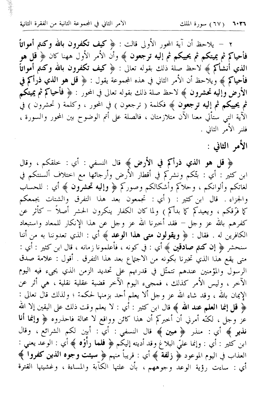 2 - يلاحظ أن آية المحور الأولى قالت: كَيْفَ تَكْفُرُونَ بِاللَّهِ وَكُنْتُمْ أَمْواتاً فَأَحْياكُمْ ثُمَّ يُمِيتُكُمْ ثُمَّ يُحْيِيكُمْ ثُمَّ إِلَيْهِ تُرْجَعُونَ وأن الأمر الأول هاهنا كان قُلْ هُوَ الَّذِي أَنْشَأَكُمْ لاحظ صلة ذلك بقوله تعالى: كَيْفَ تَكْفُرُونَ بِاللَّهِ وَكُنْتُمْ أَمْواتاً فَأَحْياكُمْ ويلاحظ أن الأمر الثاني في هذه المجموعة يقول: قُلْ هُوَ الَّذِي ذَرَأَكُمْ فِي الْأَرْضِ وَإِلَيْهِ تُحْشَرُونَ لاحظ صلة ذلك بقوله تعالى في المحور: فَأَحْياكُمْ ثُمَّ يُمِيتُكُمْ ثُمَّ يُحْيِيكُمْ ثُمَّ إِلَيْهِ تُرْجَعُونَ فكلمة (ترجعون) في المحور، وكلمة (تحشرون) في الآية التي ستأتي معنا الآن متلازمتان، فالصلة على أتم الوضوح بين المحور والسورة، فلنر الأمر الثاني.