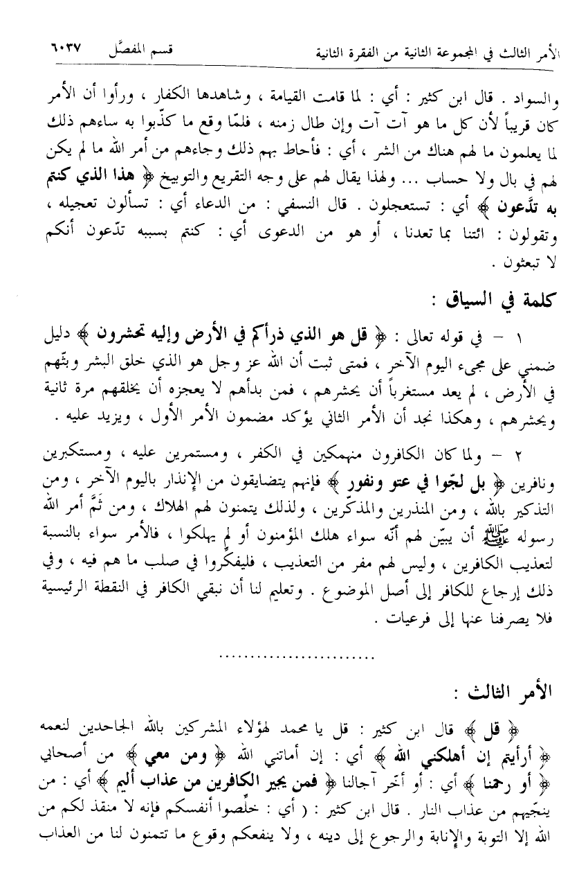 1 - في قوله تعالى: قُلْ هُوَ الَّذِي ذَرَأَكُمْ فِي الْأَرْضِ وَإِلَيْهِ تُحْشَرُونَ دليل ضمني على مجئ اليوم الآخر، فمتى ثبت أن الله عزّ وجل هو الذي خلق البشر وبثهم في الأرض، لم يعد مستغربا أن يحشرهم، فمن بدأهم لا يعجزه أن يخلقهم مرة ثانية ويحشرهم، وهكذا نجد أن الأمر الثاني يؤكد مضمون الأمر الأول، ويزيد عليه.