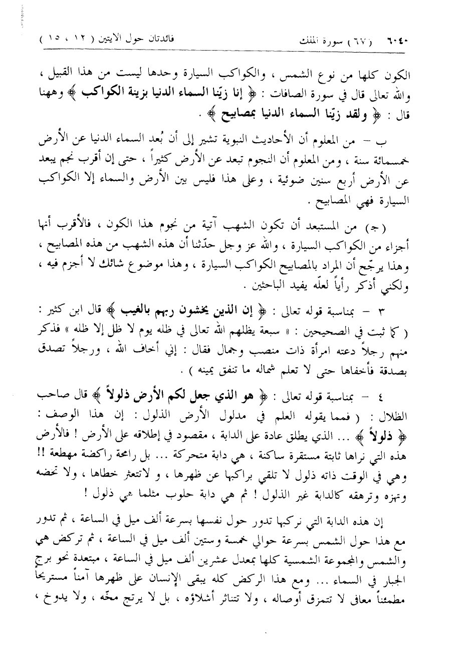 (ج) من المستبعد أن تكون الشهب آتية من نجوم هذا الكون، فالأقرب أنها أجزاء من الكواكب السيارة، والله عزّ وجل حدثنا أن هذه الشهب من هذه المصابيح، وهذا يرجح أن المراد بالمصابيح الكواكب السيارة، وهذا موضوع شائك لا أجزم فيه، ولكني أذكر رأيا لعله يفيد الباحثين.