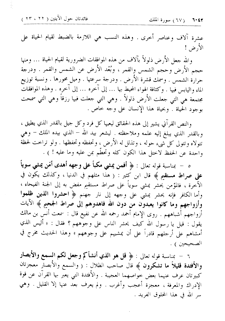 6 - بمناسبة قوله تعالى: قُلْ هُوَ الَّذِي أَنْشَأَكُمْ وَجَعَلَ لَكُمُ السَّمْعَ وَالْأَبْصارَ وَالْأَفْئِدَةَ قَلِيلًا ما تَشْكُرُونَ قال صاحب الظلال: (والسمع والأبصار معجزتان كبيرتان عرف عنهما بعض خواصهما العجيبة. والأفئدة التي يعبر بها القرآن عن قوة الإدراك والمعرفة، معجزة أعجب وأغرب. ولم يعرف بعد عنها إلا القليل. وهي سر الله في هذا المخلوق الفريد.