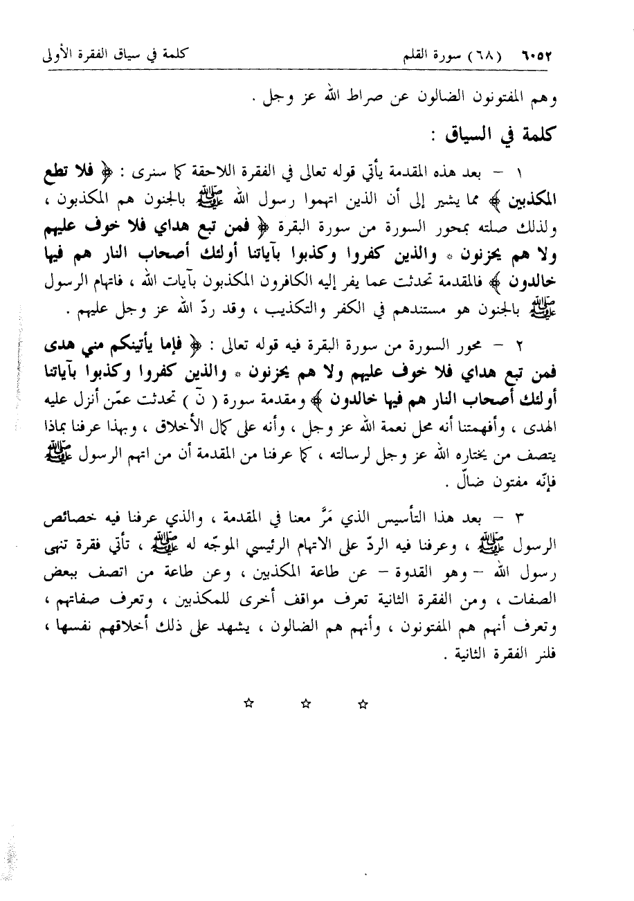 3 - بعد هذا التأسيس الذي مر معنا في المقدمة، والذي عرفنا فيه خصائص الرسول صلى الله عليه وسلم، وعرفنا فيه الرد على الاتهام الرئيسي الموجه له صلى الله عليه وسلم، تأتي فقرة تنهى رسول الله- وهو القدوة- عن طاعة المكذبين، وعن طاعة من اتصف ببعض الصفات، ومن الفقرة الثانية تعرف مواقف أخرى للمكذبين، وتعرف صفاتهم، وتعرف أنهم هم المفتونون، وأنهم هم الضالون، يشهد على ذلك أخلاقهم نفسها، فلنر الفقرة الثانية.