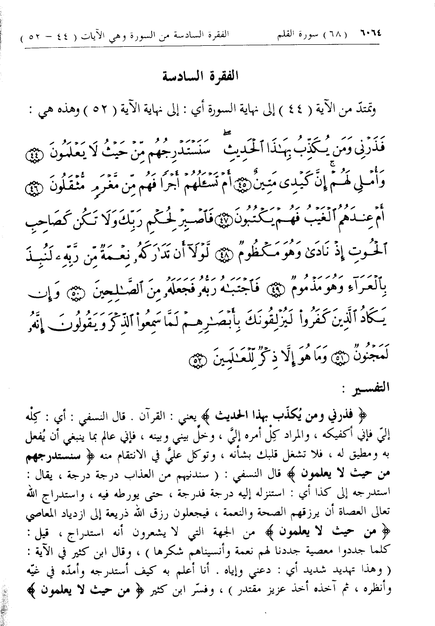 فَذَرْنِي وَمَنْ يُكَذِّبُ بِهذَا الْحَدِيثِ يعني: القرآن. قال النسفي: أي: كله إلي فإني أكفيكه، والمراد كل أمره إلي، وخل بيني وبينه، فإني عالم بما ينبغي أن يفعل به ومطيق له، فلا تشغل قلبك بشأنه، وتوكل علي في الانتقام منه سَنَسْتَدْرِجُهُمْ مِنْ حَيْثُ لا يَعْلَمُونَ قال النسفي: (سندنيهم من العذاب درجة درجة، يقال:
