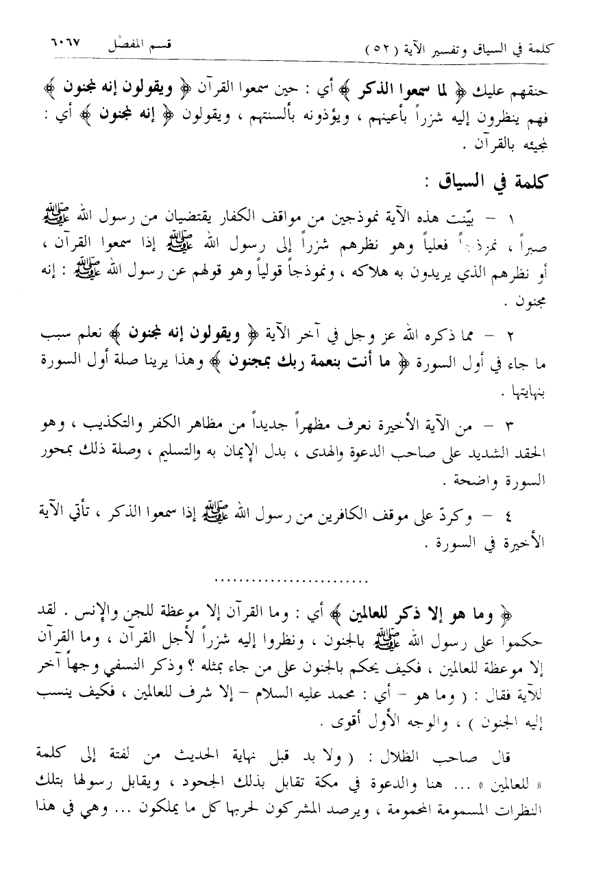 2 - مما ذكره الله عزّ وجل في آخر الآية وَيَقُولُونَ إِنَّهُ لَمَجْنُونٌ نعلم سبب ما جاء في أول السورة ما أَنْتَ بِنِعْمَةِ رَبِّكَ بِمَجْنُونٍ وهذا يرينا صلة أول السورة بنهايتها.