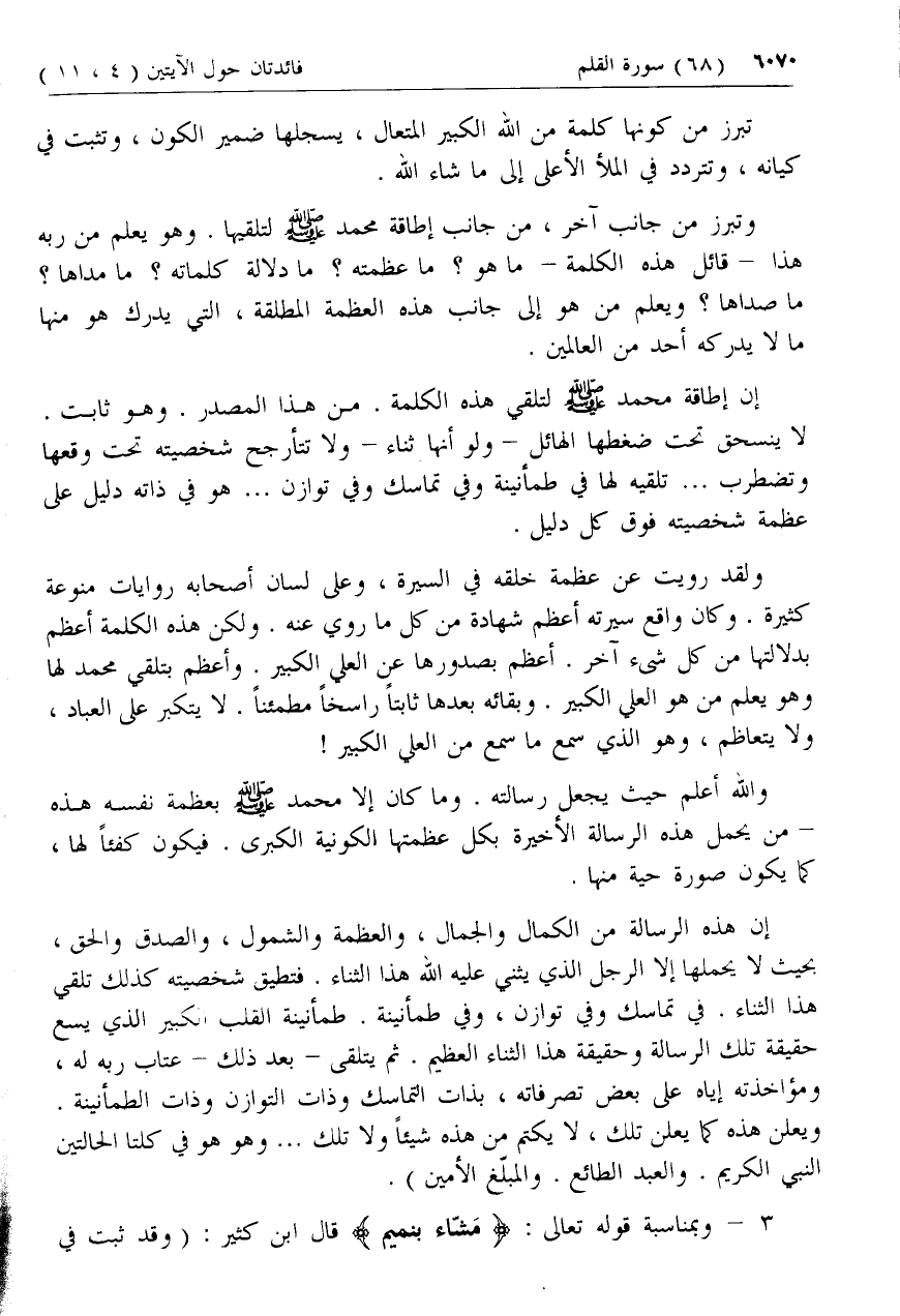 ولقد رويت عن عظمة خلقه في السيرة، وعلى لسان أصحابه روايات منوعة كثيرة. وكان واقع سيرته أعظم شهادة من كل ما روي عنه. ولكن هذه الكلمة أعظم بدلالتها من كل شئ آخر. أعظم بصدورها عن العلي الكبير. وأعظم بتلقي محمد لها وهو يعلم من هو العلي الكبير. وبقائه بعدها ثابتا راسخا مطمئنا. لا يتكبر على العباد، ولا يتعاظم، وهو الذي سمع ما سمع من العلي الكبير!