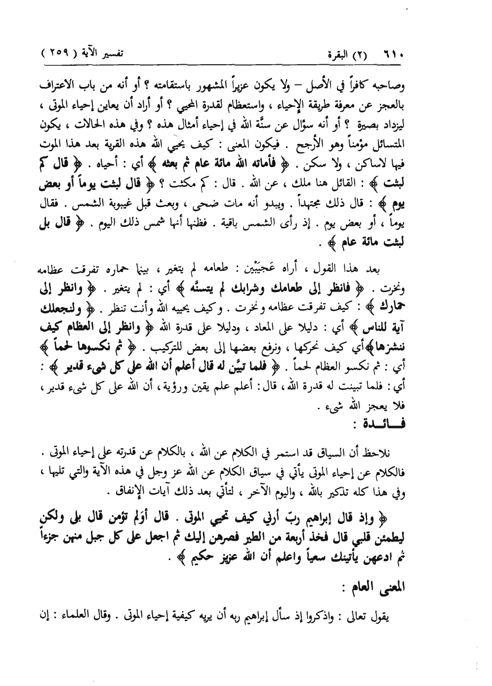 إحياء الموتى، ليزداد بصيرة؟ أو أنه سؤال عن سنة الله في إحياء أمثال هذه؟ وفي هذه الحالات، يكون المتسائل مؤمنا وهو الأرجح. فيكون المعنى: كيف يحيي الله هذه القرية بعد هذا الموت فيها لا ساكن، ولا سكن. فَأَماتَهُ اللَّهُ مِائَةَ عامٍ ثُمَّ بَعَثَهُ أي: أحياه. قالَ كَمْ لَبِثْتَ: القائل هنا ملك، عن الله. قال: كم مكثت؟ قالَ لَبِثْتُ يَوْماً أَوْ بَعْضَ يَوْمٍ: قال ذلك مجتهدا. ويبدو أنه مات ضحى، وبعث قبل غيبوبة الشمس. فقال يوما، أو بعض يوم. إذ رأى الشمس باقية. فظنها أنها شمس ذلك اليوم. قالَ بَلْ لَبِثْتَ مِائَةَ عامٍ.