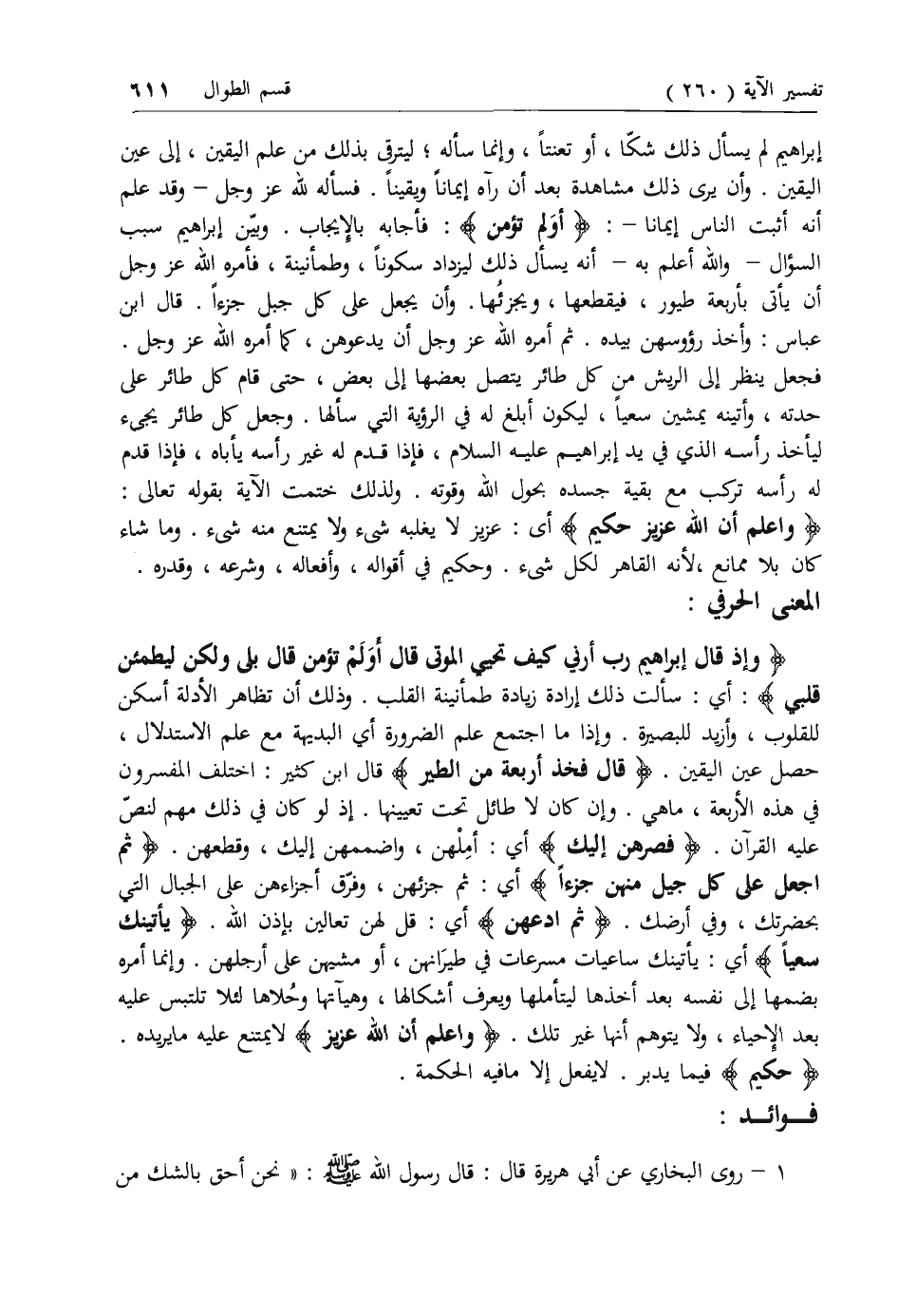وَإِذْ قالَ إِبْراهِيمُ رَبِّ أَرِنِي كَيْفَ تُحْيِ الْمَوْتى قالَ أَوَلَمْ تُؤْمِنْ قالَ بَلى وَلكِنْ لِيَطْمَئِنَّ قَلْبِي: أي: سألت ذلك إرادة زيادة طمأنينة القلب. وذلك أن تظاهر الأدلة أسكن للقلوب، وأزيد للبصيرة. وإذا ما اجتمع علم الضرورة أي البديهة مع علم الاستدلال، حصل عين اليقين. قالَ فَخُذْ أَرْبَعَةً مِنَ الطَّيْرِ قال ابن كثير: اختلف المفسرون في هذه الأربعة، ما هي. وإن كان لا طائل تحت تعيينها. إذ لو كان في ذلك مهم لنص عليه القرآن. فَصُرْهُنَّ إِلَيْكَ أي: أملهن، واضممهن إليك، وقطعهن. ثُمَّ اجْعَلْ عَلى كُلِّ جَبَلٍ مِنْهُنَّ جُزْءاً أي: ثم جزئهن. وفرق أجزاءهن على الجبال التي بحضرتك، وفي أرضك. ثُمَّ ادْعُهُنَّ أي: قل لهن تعالين بإذن الله. يَأْتِينَكَ سَعْياً أي: يأتينك ساعيات مسرعات في طيرانهن، أو مشيهن على أرجلهن. وإنما أمره بضمها إلى نفسه بعد أخذها ليتأملها ويعرف أشكالها، وهيآتها وحلاها لئلا تلتبس عليه بعد الإحياء، ولا يتوهم أنها غير تلك. وَاعْلَمْ أَنَّ اللَّهَ عَزِيزٌ لا يمتنع عليه ما يريده.