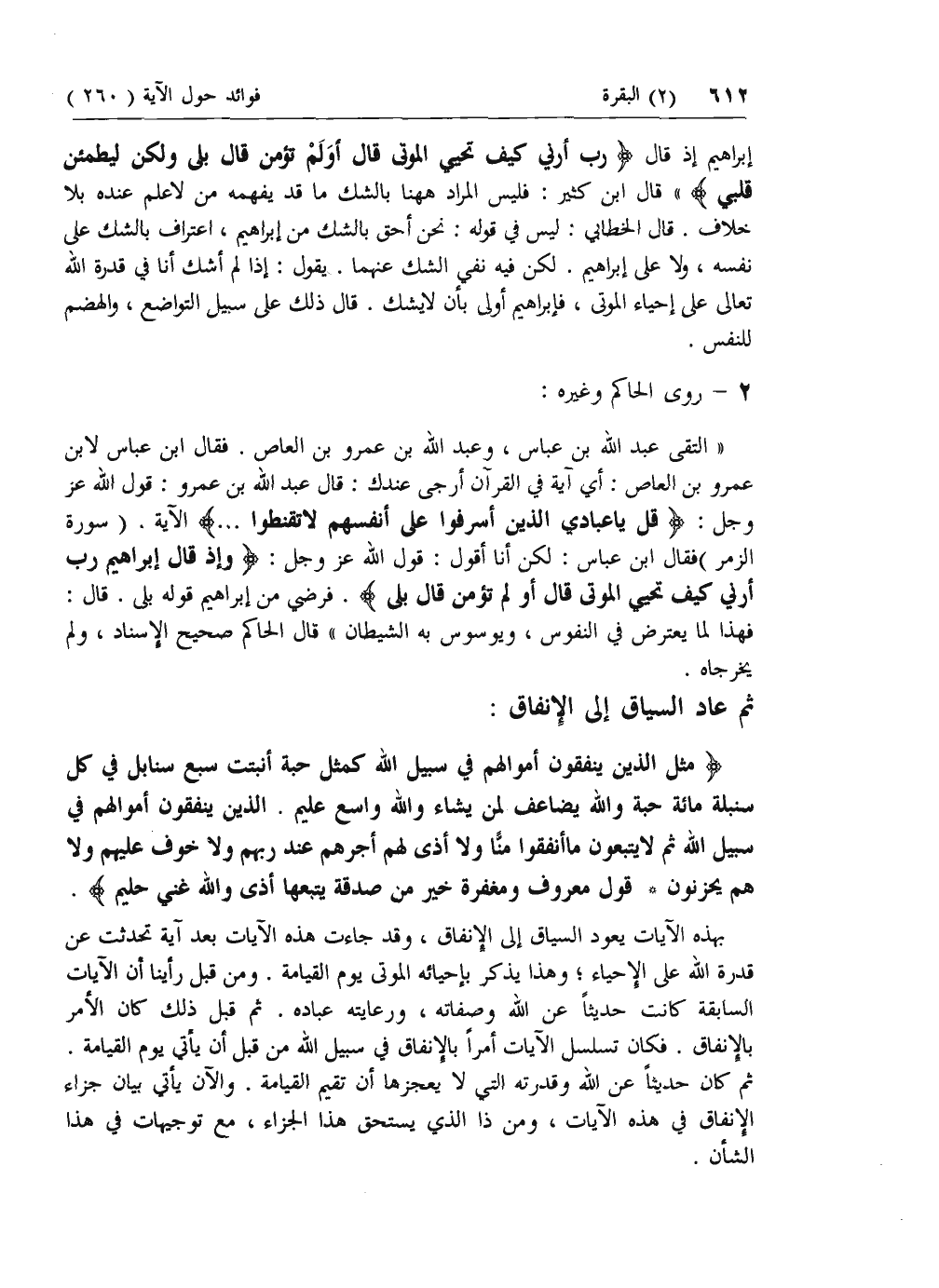 «التقى عبد الله بن عباس، وعبد الله بن عمرو بن العاص. فقال ابن عباس لابن عمرو بن العاص: أي آية في القرآن أرجى عندك: قال عبد الله بن عمرو: قول الله عزّ وجل: قُلْ يا عِبادِيَ الَّذِينَ أَسْرَفُوا عَلى أَنْفُسِهِمْ لا تَقْنَطُوا ... الآية. (سورة الزمر) فقال ابن عباس: لكن أنا أقول: قول الله عزّ وجل: وَإِذْ قالَ إِبْراهِيمُ رَبِّ أَرِنِي كَيْفَ تُحْيِ الْمَوْتى قالَ أَوَلَمْ تُؤْمِنْ قالَ بَلى. فرضي من إبراهيم قوله بلى. قال: