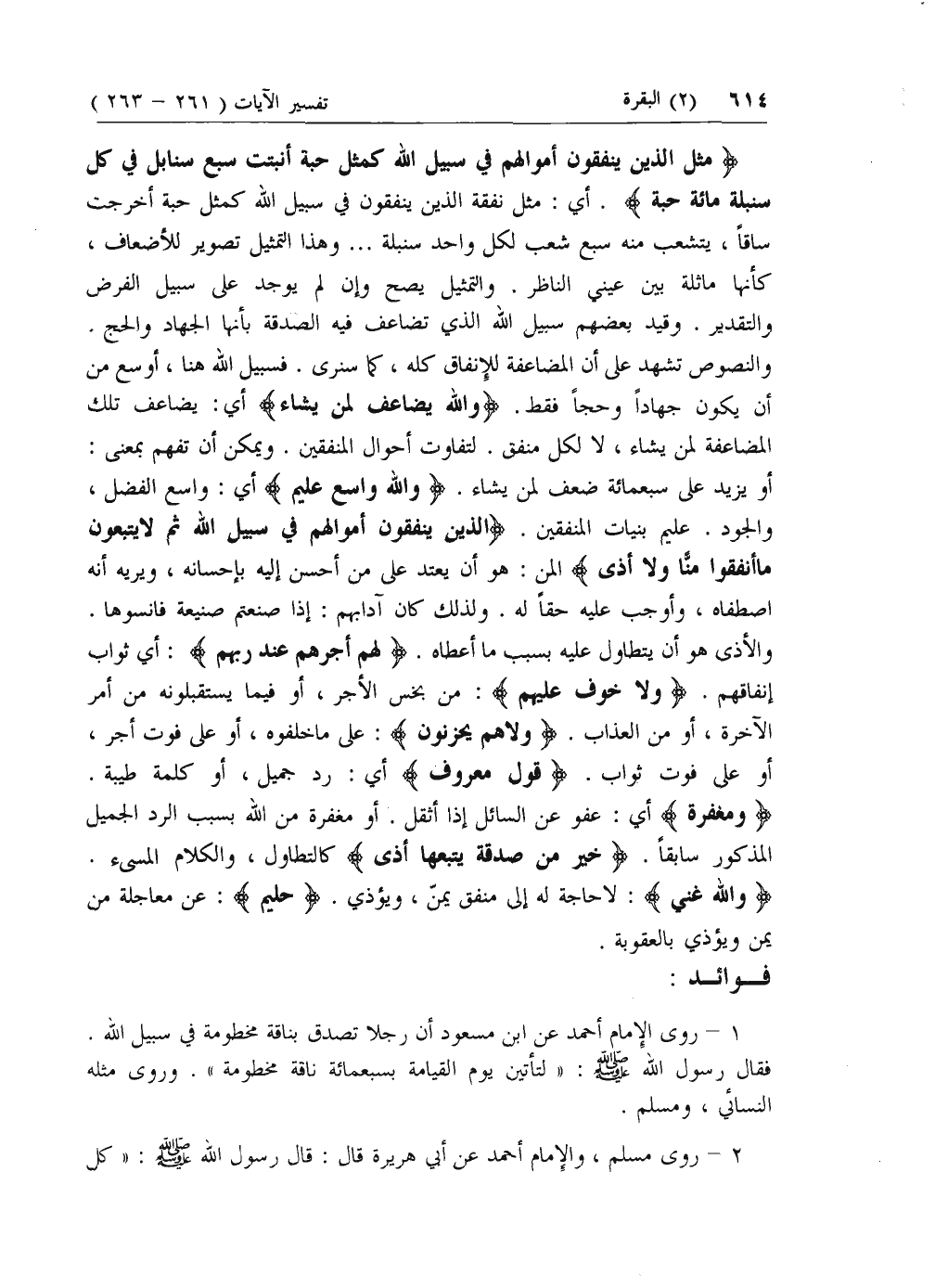 مَثَلُ الَّذِينَ يُنْفِقُونَ أَمْوالَهُمْ فِي سَبِيلِ اللَّهِ كَمَثَلِ حَبَّةٍ أَنْبَتَتْ سَبْعَ سَنابِلَ فِي كُلِّ سُنْبُلَةٍ مِائَةُ حَبَّةٍ. أي: مثل نفقة الذين ينفقون في سبيل الله كمثل حبة أخرجت ساقا، يتشعب منه سبع شعب لكل واحد سنبلة ... وهذا التمثيل تصوير للأضعاف، كأنها ماثلة بين عيني الناظر. والتمثيل يصح وإن لم يوجد على سبيل الفرض والتقدير. وقيد بعضهم سبيل الله الذي تضاعف فيه الصدقة بأنها الجهاد والحج.
