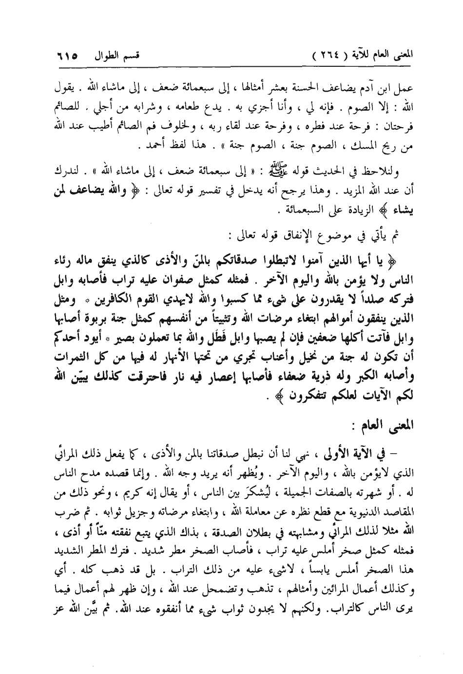 يا أَيُّهَا الَّذِينَ آمَنُوا لا تُبْطِلُوا صَدَقاتِكُمْ بِالْمَنِّ وَالْأَذى كَالَّذِي يُنْفِقُ مالَهُ رِئاءَ النَّاسِ وَلا يُؤْمِنُ بِاللَّهِ وَالْيَوْمِ الْآخِرِ. فَمَثَلُهُ كَمَثَلِ صَفْوانٍ عَلَيْهِ تُرابٌ فَأَصابَهُ وابِلٌ فَتَرَكَهُ صَلْداً لا يَقْدِرُونَ عَلى شَيْءٍ مِمَّا كَسَبُوا وَاللَّهُ لا يَهْدِي الْقَوْمَ الْكافِرِينَ* وَمَثَلُ الَّذِينَ يُنْفِقُونَ أَمْوالَهُمُ ابْتِغاءَ مَرْضاتِ اللَّهِ وَتَثْبِيتاً مِنْ أَنْفُسِهِمْ كَمَثَلِ جَنَّةٍ بِرَبْوَةٍ أَصابَها وابِلٌ فَآتَتْ أُكُلَها ضِعْفَيْنِ فَإِنْ لَمْ يُصِبْها وابِلٌ فَطَلٌّ وَاللَّهُ بِما تَعْمَلُونَ بَصِيرٌ* أَيَوَدُّ أَحَدُكُمْ أَنْ تَكُونَ لَهُ جَنَّةٌ مِنْ نَخِيلٍ وَأَعْنابٍ تَجْرِي مِنْ تَحْتِهَا الْأَنْهارُ لَهُ فِيها مِنْ كُلِّ الثَّمَراتِ وَأَصابَهُ الْكِبَرُ وَلَهُ ذُرِّيَّةٌ ضُعَفاءُ فَأَصابَها إِعْصارٌ فِيهِ نارٌ فَاحْتَرَقَتْ كَذلِكَ يُبَيِّنُ اللَّهُ لَكُمُ الْآياتِ لَعَلَّكُمْ تَتَفَكَّرُونَ.
