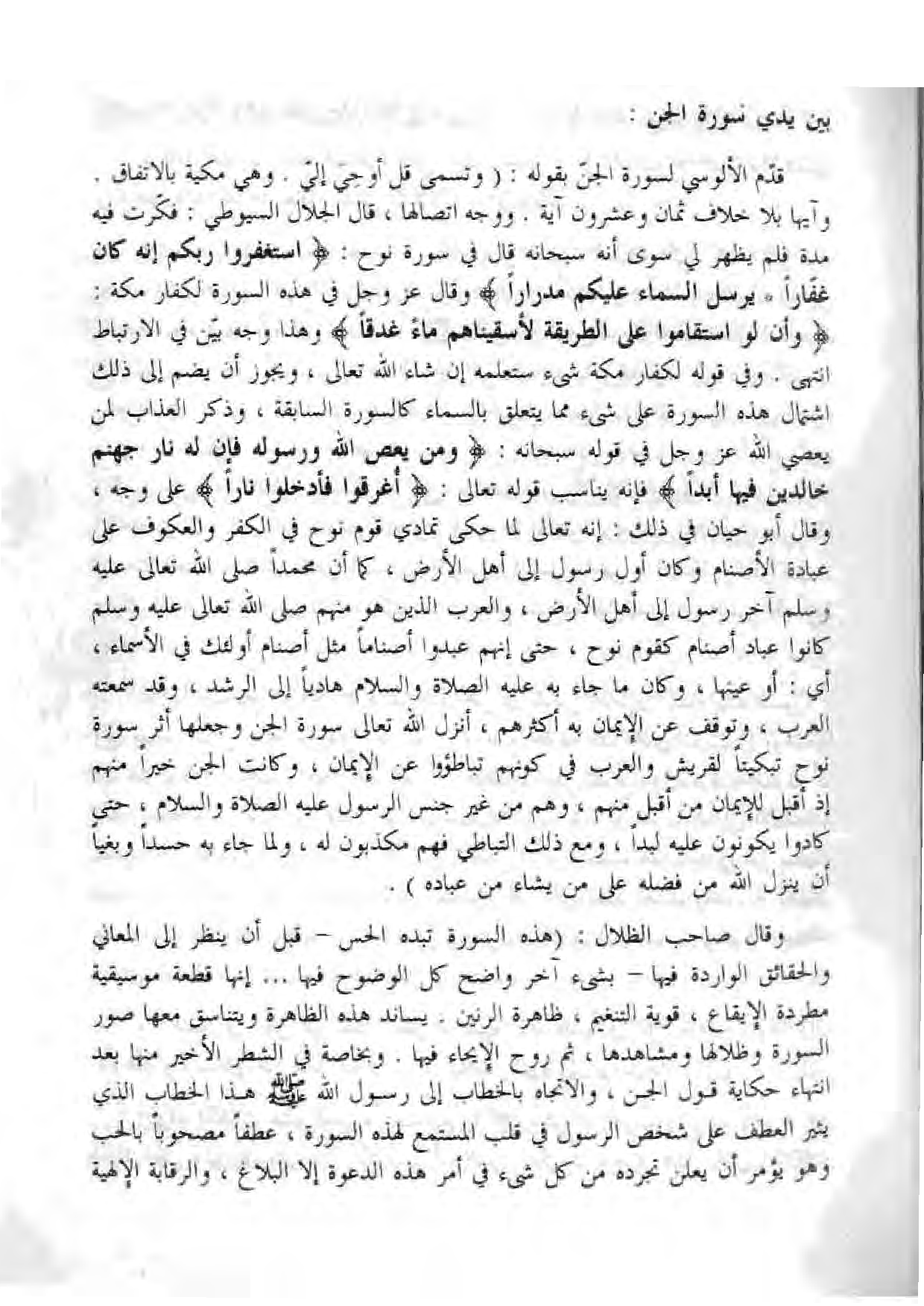 وقال صاحب الظلال: (هذه السورة تبده الحس- قبل أن ينظر إلى المعاني والحقائق الواردة فيها- بشيء آخر واضح كل الوضوح فيها ... إنها قطعة موسيقية مطردة الإيقاع، قوية التنغيم، ظاهرة الرنين. يساند هذه الظاهرة ويتناسق معها صور السورة وظلالها ومشاهدها، ثم روح الإيحاء فيها. وبخاصة في الشطر الأخير منها بعد انتهاء حكاية قول الجن، والاتجاه بالخطاب إلى رسول الله صلى الله عليه وسلم هذا الخطاب الذي يثير العطف على شخص الرسول في قلب المستمع لهذه السورة، عطفا مصحوبا بالحب وهو يؤمر أن يعلن تجرده من كل شئ في أمر هذه الدعوة إلا البلاغ، والرقابة الإلهية