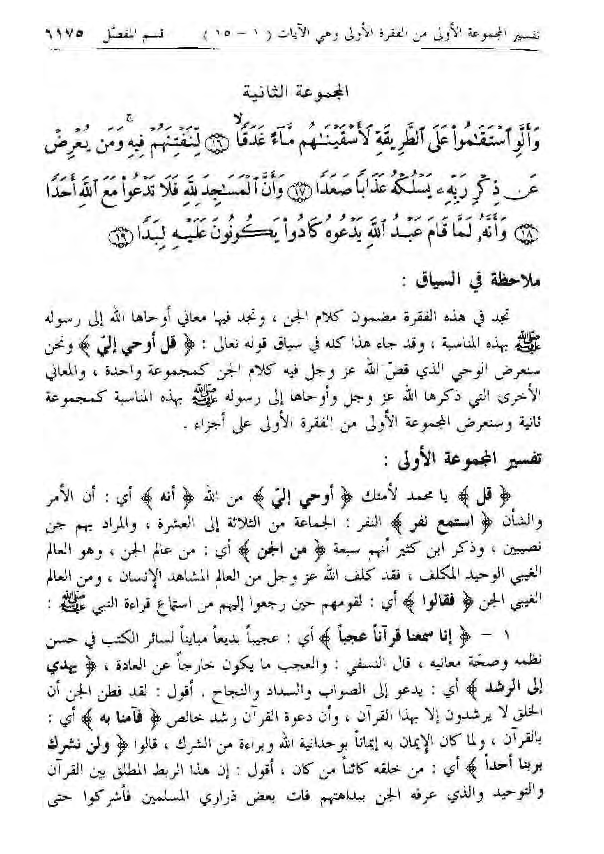 تجد في هذه الفقرة مضمون كلام الجن، وتجد فيها معاني أوحاها الله إلى رسوله صلى الله عليه وسلم بهذه المناسبة، وقد جاء هذا كله في سياق قوله تعالى: قُلْ أُوحِيَ إِلَيَّ ونحن سنعرض الوحي الذي قص الله عزّ وجل فيه كلام الجن كمجموعة واحدة، والمعاني الأخرى التي ذكرها الله عزّ وجل وأوحاها إلى رسوله صلى الله عليه وسلم بهذه المناسبة كمجموعة ثانية وسنعرض المجموعة الأولى من الفقرة الأولى على أجزاء.