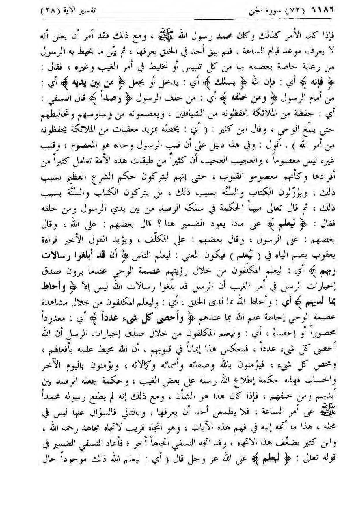 ويؤمنون باليوم الآخر والحساب فهذه حكمة اطلاع الله رسله على بعض الغيب، وحكمة جعله الرصد بين أيديهم ومن خلفهم، فإذا كان هذا هو الشأن، ومع ذلك إنه لم يطلع رسوله محمدا صلى الله عليه وسلم على أمر الساعة، فلا يطمعن أحد أن يعرفها، وبالتالي فالسؤال عنها ليس في محله، هذا ما أتجه إليه في فهم هذه الآيات، وهو اتجاه قريب لاتجاه مجاهد رحمه الله، وابن كثير يضعف هذا الاتجاه، وقد اتجه النسفي اتجاها آخر؛ فأعاد النسفي الضمير في قوله تعالى: لِيَعْلَمَ على الله عزّ وجل قال (أي: ليعلم الله ذلك موجودا حال