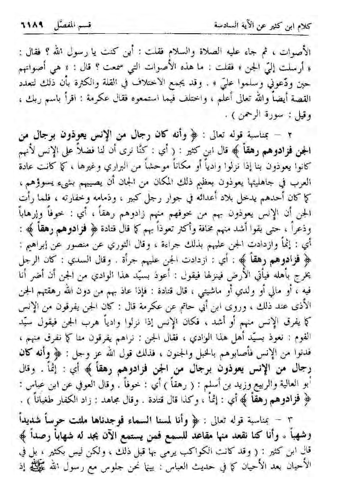 2 - بمناسبة قوله تعالى: وَأَنَّهُ كانَ رِجالٌ مِنَ الْإِنْسِ يَعُوذُونَ بِرِجالٍ مِنَ الْجِنِّ فَزادُوهُمْ رَهَقاً قال ابن كثير: (أي: كنا نرى أن لنا فضلا على الإنس لأنهم كانوا يعوذون بنا إذا نزلوا واديا أو مكانا موحشا من البراري وغيرها، كما كانت عادة العرب في جاهليتها يعوذون بعظيم ذلك المكان من الجان أن يصيبهم بشيء يسوؤهم، كما كان أحدهم يدخل بلاد أعدائه في جوار رجل كبير، وذمامه وخفارته، فلما رأت الجن أن الإنس يعوذون بهم من خوفهم منهم زادوهم رهقا، أي: خوفا وإرهابا وذعرا، حتى بقوا أشد منهم مخافة وأكثر تعوذا بهم كما قال قتادة فَزادُوهُمْ رَهَقاً: