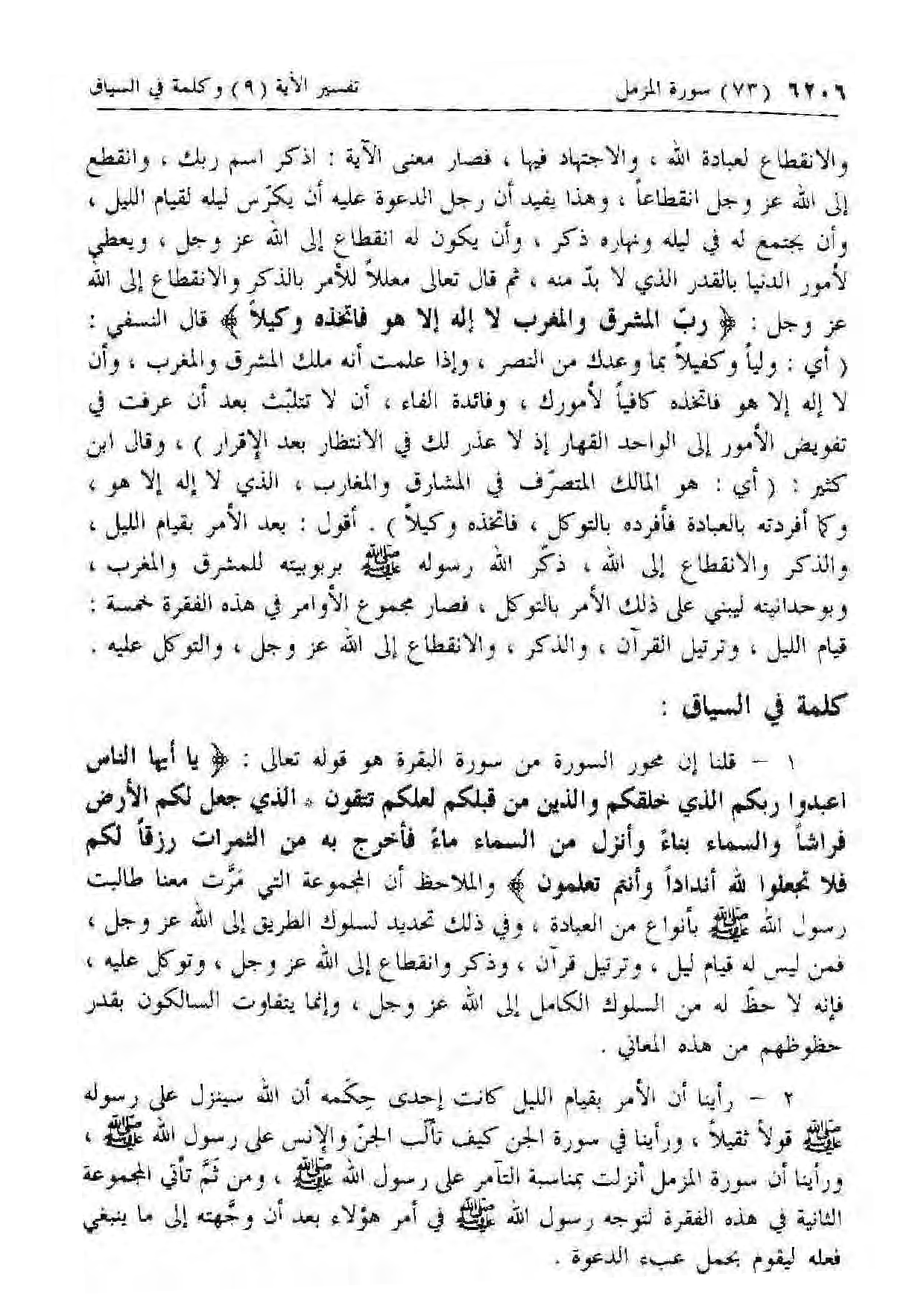 1 - قلنا إن محور السورة من سورة البقرة هو قوله تعالى: يا أَيُّهَا النَّاسُ اعْبُدُوا رَبَّكُمُ الَّذِي خَلَقَكُمْ وَالَّذِينَ مِنْ قَبْلِكُمْ لَعَلَّكُمْ تَتَّقُونَ* الَّذِي جَعَلَ لَكُمُ الْأَرْضَ فِراشاً وَالسَّماءَ بِناءً وَأَنْزَلَ مِنَ السَّماءِ ماءً فَأَخْرَجَ بِهِ مِنَ الثَّمَراتِ رِزْقاً لَكُمْ فَلا تَجْعَلُوا لِلَّهِ أَنْداداً وَأَنْتُمْ تَعْلَمُونَ والملاحظ أن المجموعة التي مرت معنا طالبت رسول الله صلى الله عليه وسلم بأنواع من العبادة، وفي ذلك تحديد لسلوك الطريق إلى الله عزّ وجل، فمن ليس له قيام ليل، وترتيل قرآن، وذكر وانقطاع إلى الله عزّ وجل، وتوكل عليه، فإنه لا حظ له من السلوك الكامل إلى الله عزّ وجل، وإنما يتفاوت السالكون بقدر حظوظهم من هذه المعاني.