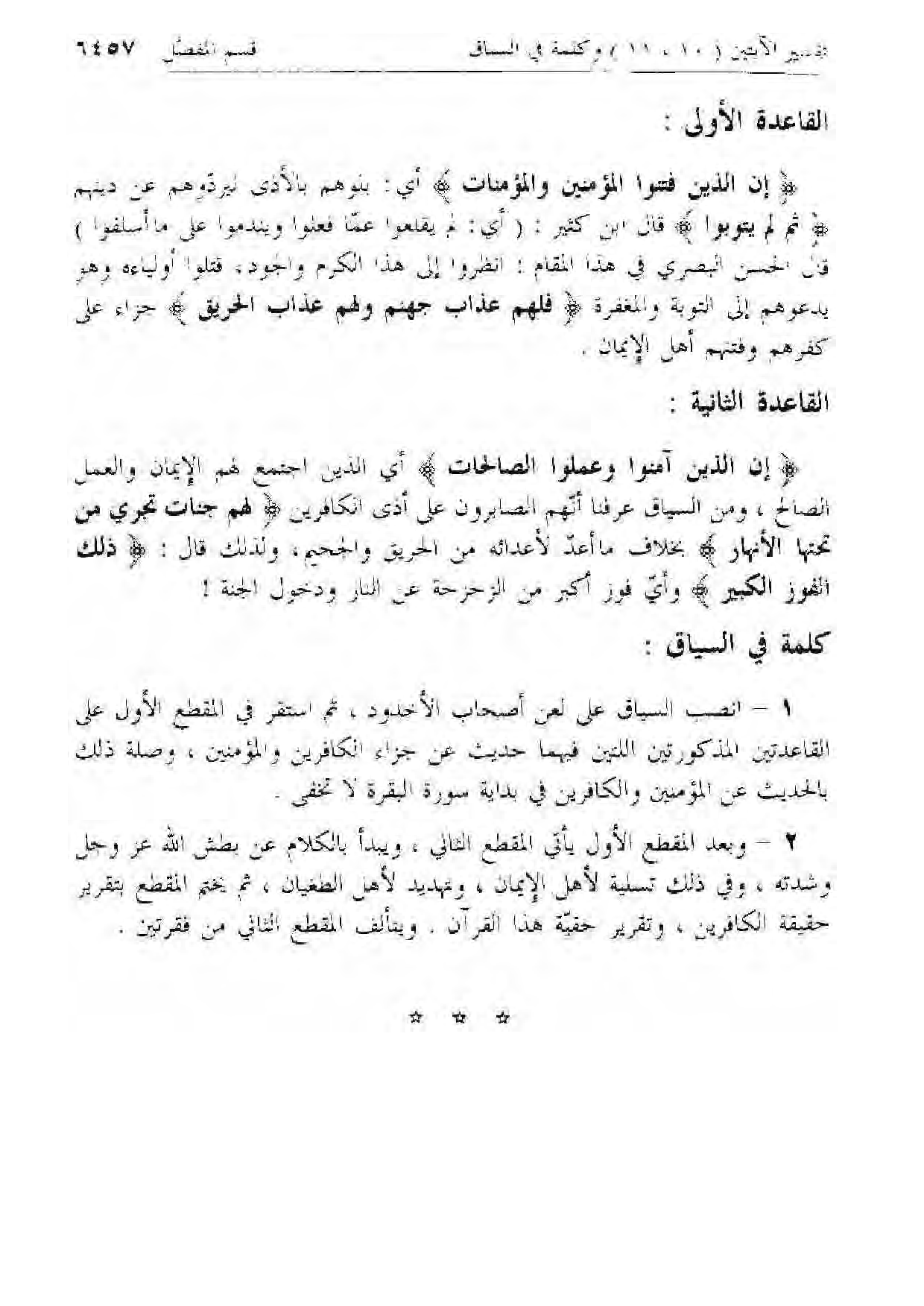 1 - انصب السياق على لعن أصحاب الأخدود، ثم استقر في المقطع الأول على القاعدتين المذكورتين اللتين فيهما حديث عن جزاء الكافرين والمؤمنين، وصلة ذلك بالحديث عن المؤمنين والكافرين في بداية سورة البقرة لا تخفى.