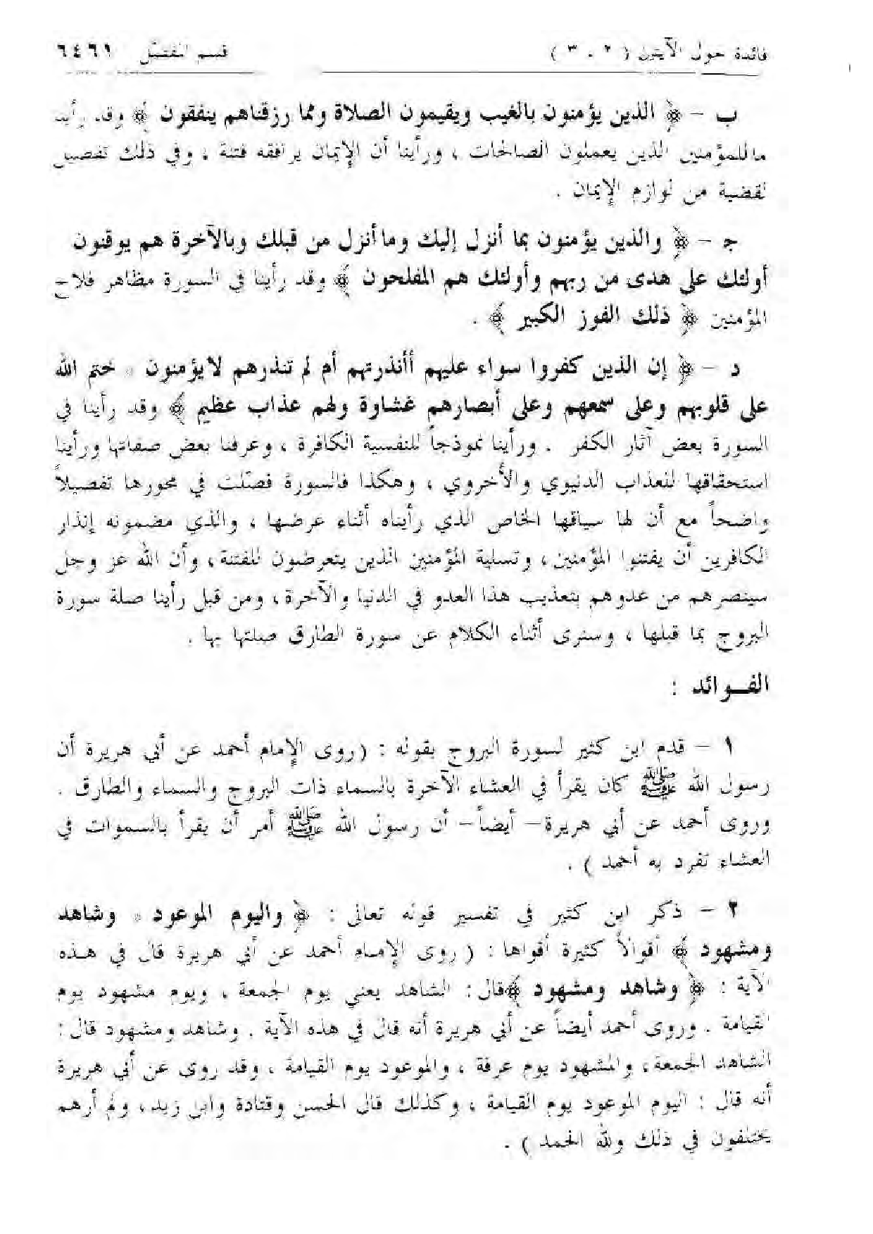 ج- وَالَّذِينَ يُؤْمِنُونَ بِما أُنْزِلَ إِلَيْكَ وَما أُنْزِلَ مِنْ قَبْلِكَ وَبِالْآخِرَةِ هُمْ يُوقِنُونَ* أُولئِكَ عَلى هُدىً مِنْ رَبِّهِمْ وَأُولئِكَ هُمُ الْمُفْلِحُونَ وقد رأينا في السورة مظاهر فلاح المؤمنين ذلِكَ الْفَوْزُ الْكَبِيرُ.
