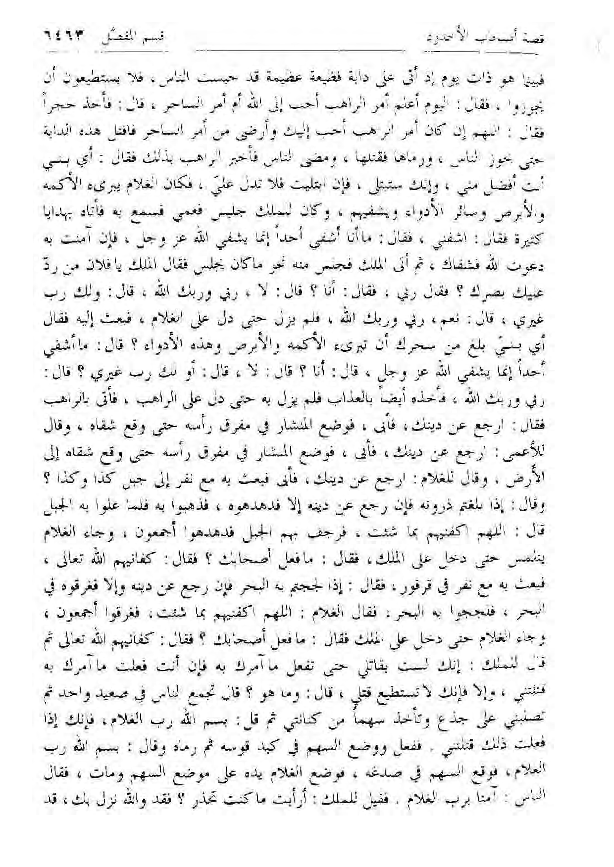 وقال: إذا بلغتم ذروته فإن رجع عن دينه إلا فدهدهوه، فذهبوا به فلما علوا به الجبل قال: اللهم اكفنيهم بما شئت، فرجف بهم الجبل فدهدهوا أجمعون، وجاء الغلام يتلمس حتى دخل على الملك، فقال: ما فعل أصحابك؟ فقال: كفانيهم الله تعالى، فبعث به مع نفر في قرقور، فقال: إذا لججتم به البحر فإن رجع عن دينه وإلا فغرقوه في البحر، فلججوا به البحر، فقال الغلام: اللهم اكفنيهم بما شئت، فغرقوا أجمعون، وجاء الغلام حتى دخل على الملك فقال: ما فعل أصحابك؟ فقال: كفانيهم الله تعالى ثم قال للملك: إنك لست بقاتلي حتى تفعل ما آمرك به فإن أنت فعلت ما آمرك به قتلتني، وإلا فإنك لا تستطيع قتلي، قال: وما هو؟ قال تجمع الناس في صعيد واحد ثم تصلبني على جذع وتأخذ سهما من كنانتي ثم قل: بسم الله رب الغلام، فإنك إذا فعلت ذلك قتلتني. ففعل ووضع السهم في كبد قوسه ثم رماه وقال: بسم الله رب الغلام، فوقع السهم في صدغه، فوضع الغلام يده على موضع السهم ومات، فقال الناس: آمنا برب الغلام. فقيل للملك: أرأيت ما كنت تحذر؟ فقد والله نزل بك، قد