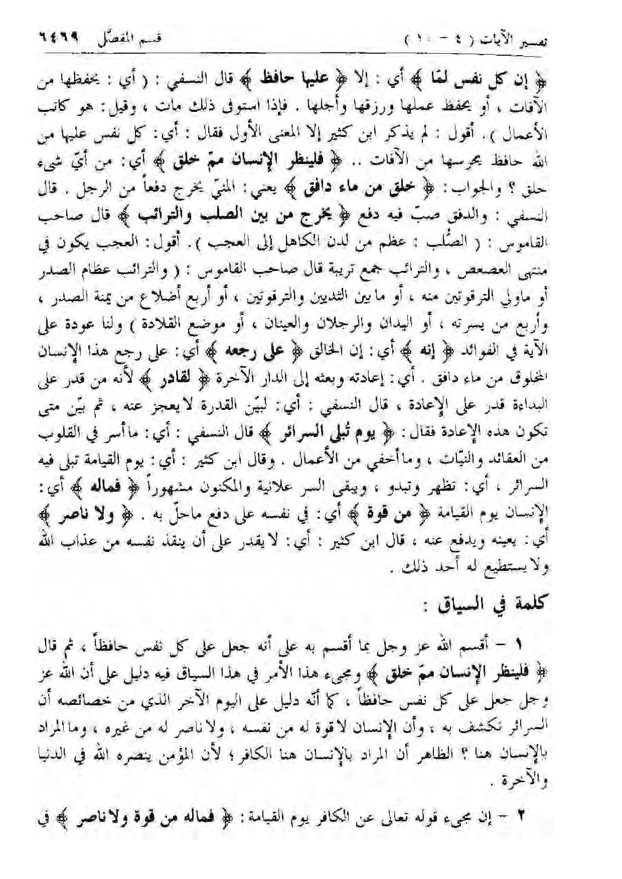 1 - أقسم الله عز وجل بما أقسم به على أنه جعل على كل نفس حافظا، ثم قال فَلْيَنْظُرِ الْإِنْسانُ مِمَّ خُلِقَ ومجئ هذا الأمر في هذا السياق فيه دليل على أن الله عز وجل جعل على كل نفس حافظا، كما أنه دليل على اليوم الآخر الذي من خصائصه أن السرائر تكشف به، وأن الإنسان لا قوة له من نفسه، ولا ناصر له من غيره، وما المراد بالإنسان هنا؟ الظاهر أن المراد بالإنسان هنا الكافر؛ لأن المؤمن ينصره الله في الدنيا والآخرة.