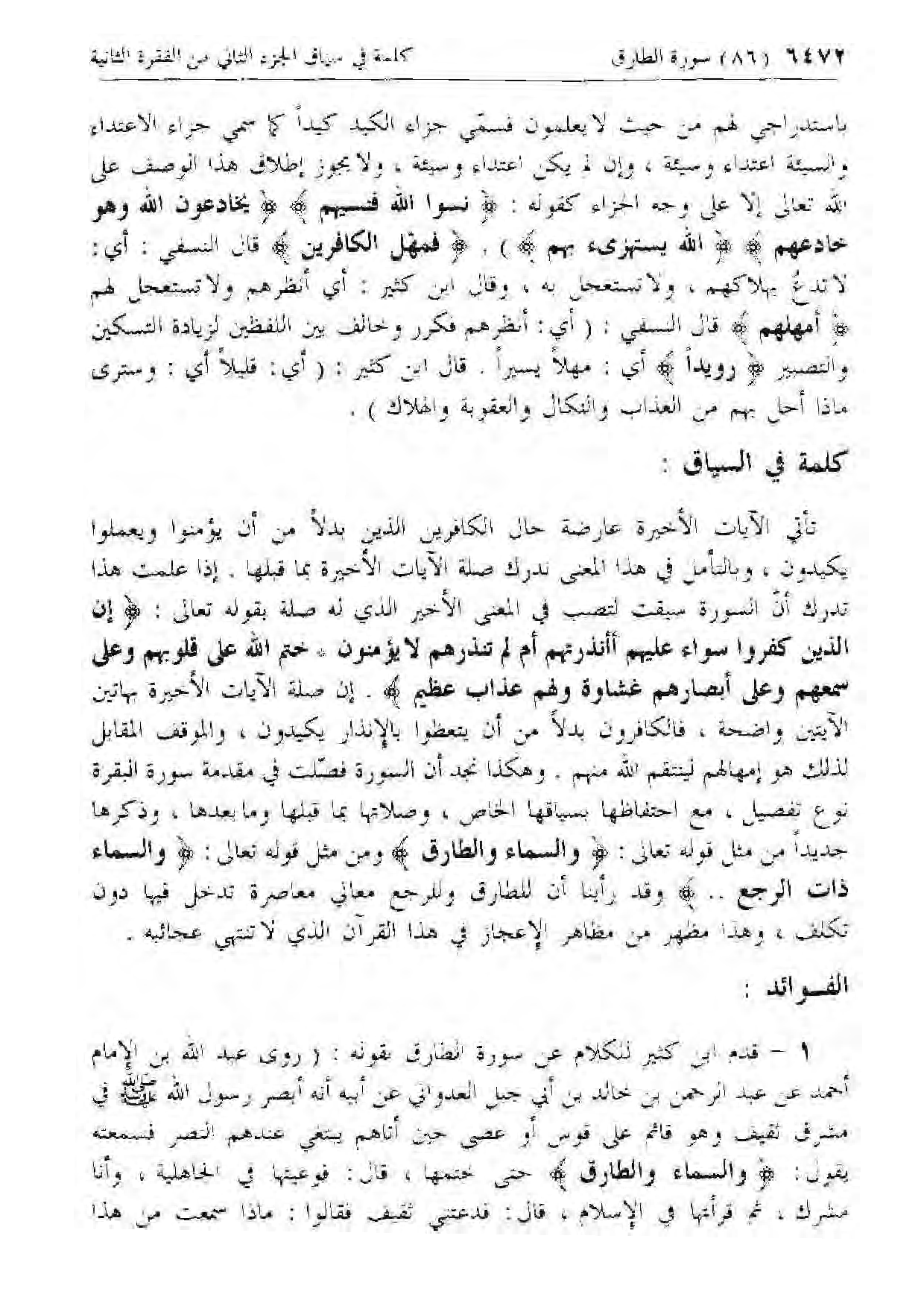 1 - قدم ابن كثير للكلام عن سورة الطارق بقوله: (روى عبد الله بن الإمام أحمد عن عبد الرحمن بن خالد بن أبي جبل العدواني عن أبيه أنه أبصر رسول الله صلى الله عليه وسلم في مشرق ثقيف وهو قائم على قوس أو عصى حين أتاهم يبتغي عندهم النصر فسمعته يقول: وَالسَّماءِ وَالطَّارِقِ حتى ختمها، قال: فوعيتها في الجاهلية، وأنا مشرك، ثم قرأتها في الإسلام، قال: فدعتني ثقيف فقالوا: ماذا سمعت من هذا