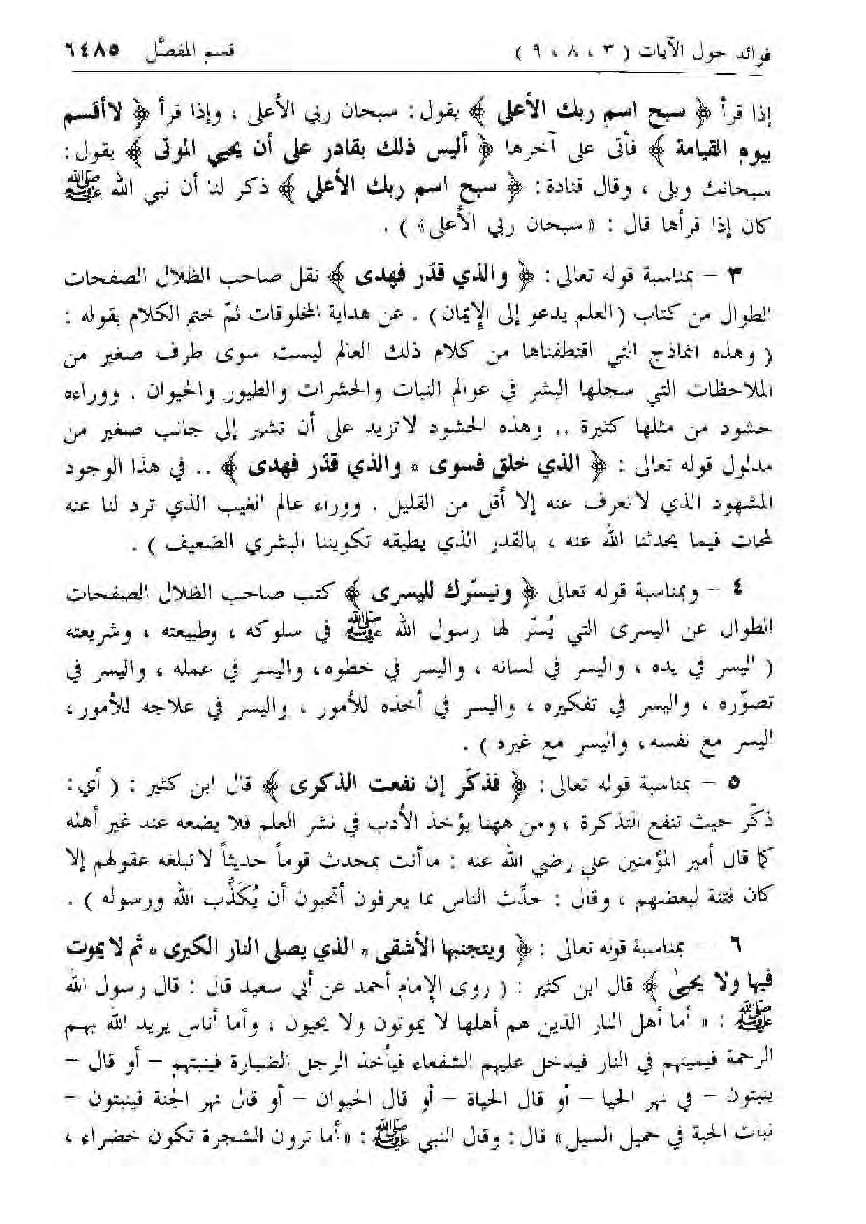6 - بمناسبة قوله تعالى: وَيَتَجَنَّبُهَا الْأَشْقَى* الَّذِي يَصْلَى النَّارَ الْكُبْرى * ثُمَّ لا يَمُوتُ فِيها وَلا يَحْيى قال ابن كثير: (روى الإمام أحمد عن أبي سعيد قال: قال رسول الله صلى الله عليه وسلم: «أما أهل النار الذين هم أهلها لا يموتون ولا يحيون، وأما أناس يريد الله بهم الرحمة فيميتهم في النار فيدخل عليهم الشفعاء فيأخذ الرجل الضبارة فينبتهم- أو قال- ينبتون- في نهر الحيا- أو قال الحياة- أو قال الحيوان- أو قال نهر الجنة فينبتون- نبات الحبة في حميل السيل» قال: وقال النبي صلى الله عليه وسلم: «أما ترون الشجرة تكون خضراء،