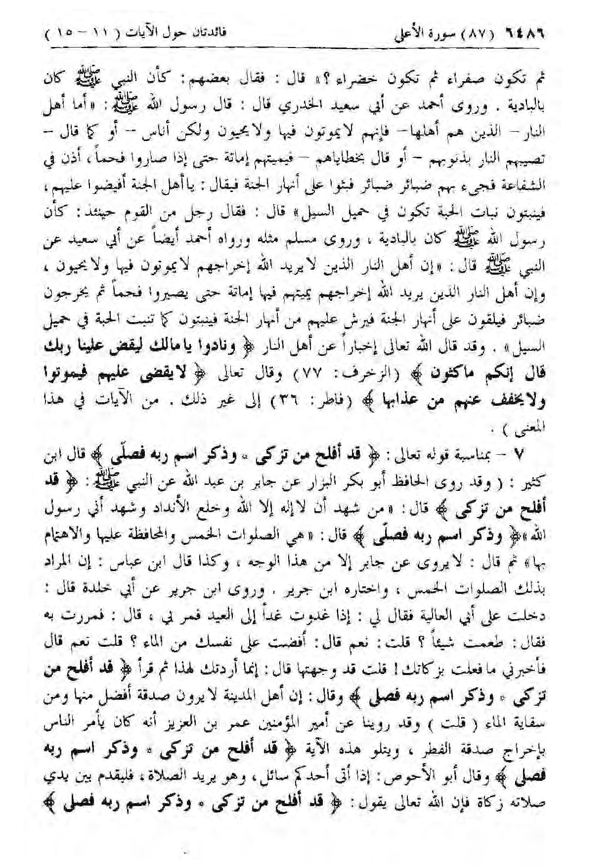 7 - بمناسبة قوله تعالى: قَدْ أَفْلَحَ مَنْ تَزَكَّى* وَذَكَرَ اسْمَ رَبِّهِ فَصَلَّى قال ابن كثير: (وقد روى الحافظ أبو بكر البزار عن جابر بن عبد الله عن النبي صلى الله عليه وسلم: قَدْ أَفْلَحَ مَنْ تَزَكَّى قال: «من شهد أن لا إله إلا الله وخلع الأنداد وشهد أني رسول الله» وَذَكَرَ اسْمَ رَبِّهِ فَصَلَّى قال: «هي الصلوات الخمس والمحافظة عليها والاهتمام بها» ثم قال: لا يروى عن جابر إلا من هذا الوجه، وكذا قال ابن عباس: إن المراد بذلك الصلوات الخمس، واختاره ابن جرير. وروى ابن جرير عن أبي خلدة قال: