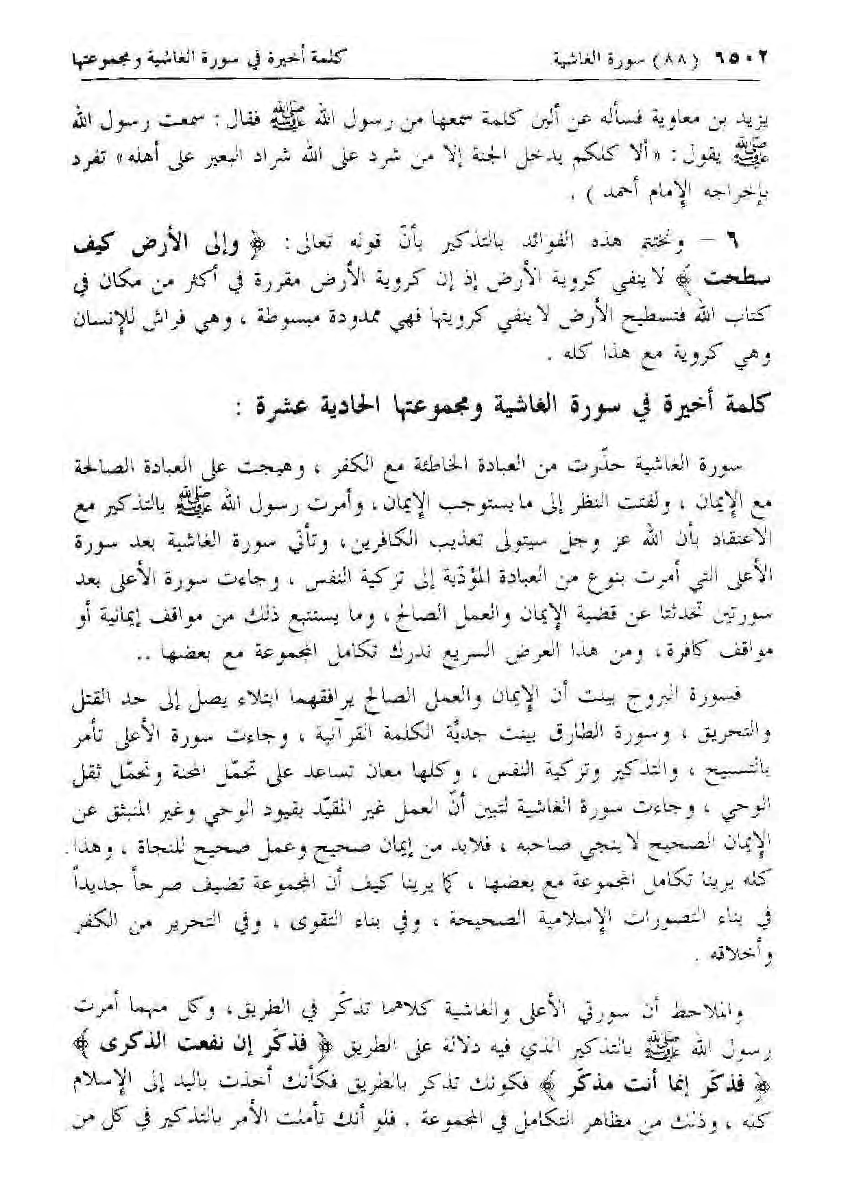 والملاحظ أن سورتي الأعلى والغاشية كلاهما تذكر في الطريق، وكل منهما أمرت رسول الله صلى الله عليه وسلم بالتذكير الذي فيه دلالة على الطريق فَذَكِّرْ إِنْ نَفَعَتِ الذِّكْرى فَذَكِّرْ إِنَّما أَنْتَ مُذَكِّرٌ فكونك تذكر بالطريق فكأنك أخذت باليد إلى الإسلام كله، وذلك من مظاهر التكامل في المجموعة. فلو أنك تأملت الأمر بالتذكير في كل من
