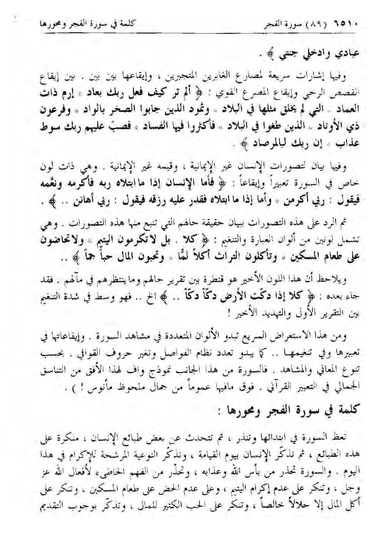 وفيها إشارات سريعة لمصارع الغابرين المتجبرين، وإيقاعها بين بين. بين إيقاع القصص الرخي وإيقاع المصرع القوي: أَلَمْ تَرَ كَيْفَ فَعَلَ رَبُّكَ بِعادٍ* إِرَمَ ذاتِ الْعِمادِ* الَّتِي لَمْ يُخْلَقْ مِثْلُها فِي الْبِلادِ* وَثَمُودَ الَّذِينَ جابُوا الصَّخْرَ بِالْوادِ* وَفِرْعَوْنَ ذِي الْأَوْتادِ* الَّذِينَ طَغَوْا فِي الْبِلادِ* فَأَكْثَرُوا فِيهَا الْفَسادَ* فَصَبَّ عَلَيْهِمْ رَبُّكَ سَوْطَ عَذابٍ* إِنَّ رَبَّكَ لَبِالْمِرْصادِ.