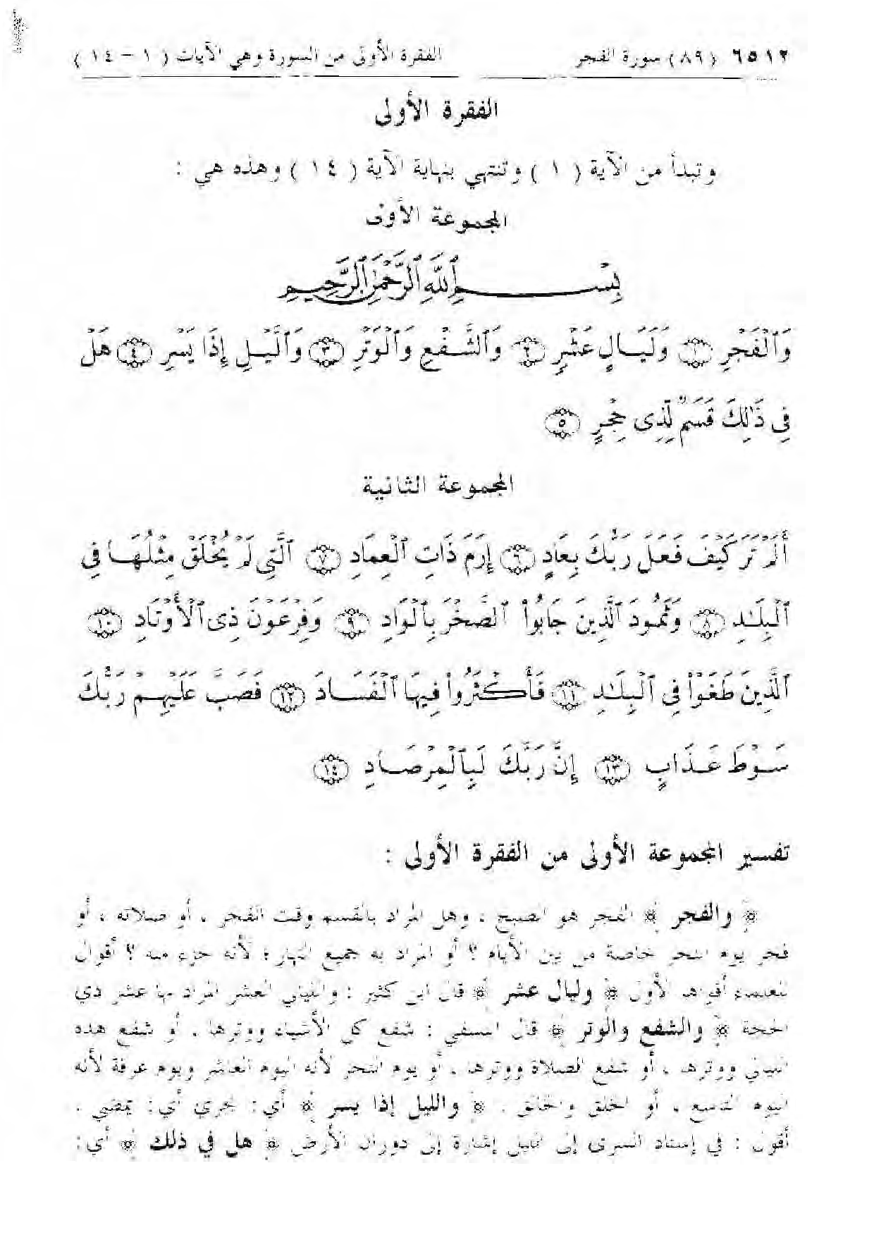 وَالْفَجْرِ الفجر هو الصبح، وهل المراد بالقسم وقت الفجر، أو صلاته، أو فجر يوم النحر خاصة من بين الأيام؟ أو المراد به جميع النهار؛ لأنه جزء منه؟ أقوال للعلماء أقواها الأول