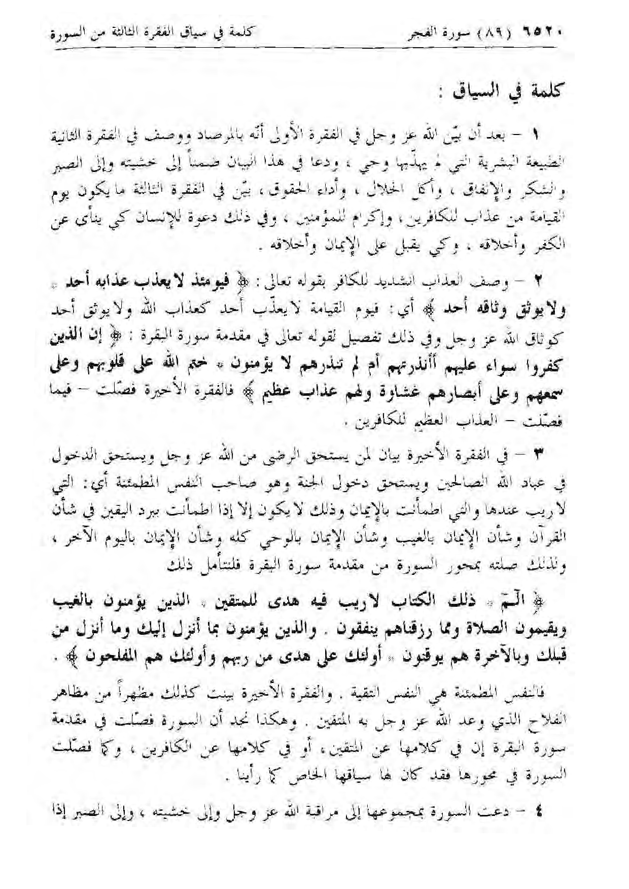 فالنفس المطمئنة هي النفس التقية. والفقرة الأخيرة بينت كذلك مظهرا من مظاهر الفلاح الذي وعد الله عزّ وجل به المتقين. وهكذا نجد أن السورة فصلت في مقدمة سورة البقرة إن في كلامها عن المتقين، أو في كلامها عن الكافرين، وكما فصلت السورة في محورها فقد كان لها سياقها الخاص كما رأينا.