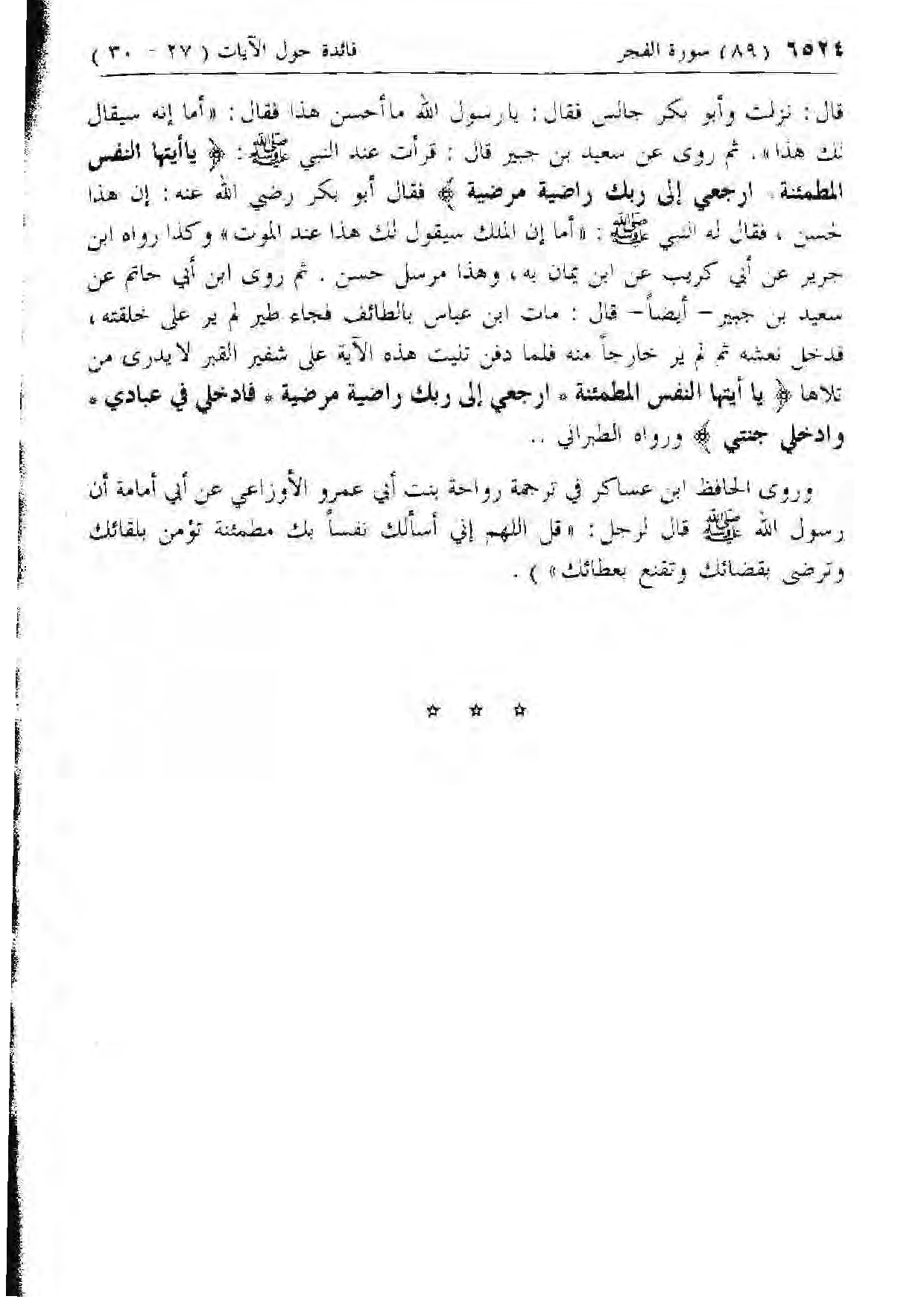 قال: نزلت وأبو بكر جالس فقال: يا رسول الله ما أحسن هذا فقال: «أما إنه سيقال لك هذا». ثم روى عن سعيد بن جبير قال: قرأت عند النبي صلى الله عليه وسلم: يا أَيَّتُهَا النَّفْسُ الْمُطْمَئِنَّةُ* ارْجِعِي إِلى رَبِّكِ راضِيَةً مَرْضِيَّةً فقال أبو بكر رضي الله عنه: إن هذا لحسن، فقال له النبي صلى الله عليه وسلم: «أما إن الملك سيقول لك هذا عند الموت» وكذا رواه ابن جرير عن أبي كريب عن ابن يمان به، وهذا مرسل حسن. ثم روى ابن أبي حاتم عن سعيد بن جبير- أيضا- قال: مات ابن عباس بالطائف فجاء طير لم ير على خلقته، فدخل نعشه ثم لم ير خارجا منه فلما دفن تليت هذه الآية على شفير القبر لا يدرى من تلاها يا أَيَّتُهَا النَّفْسُ الْمُطْمَئِنَّةُ* ارْجِعِي إِلى رَبِّكِ راضِيَةً مَرْضِيَّةً* فَادْخُلِي فِي عِبادِي* وَادْخُلِي جَنَّتِي ورواه الطبراني ..