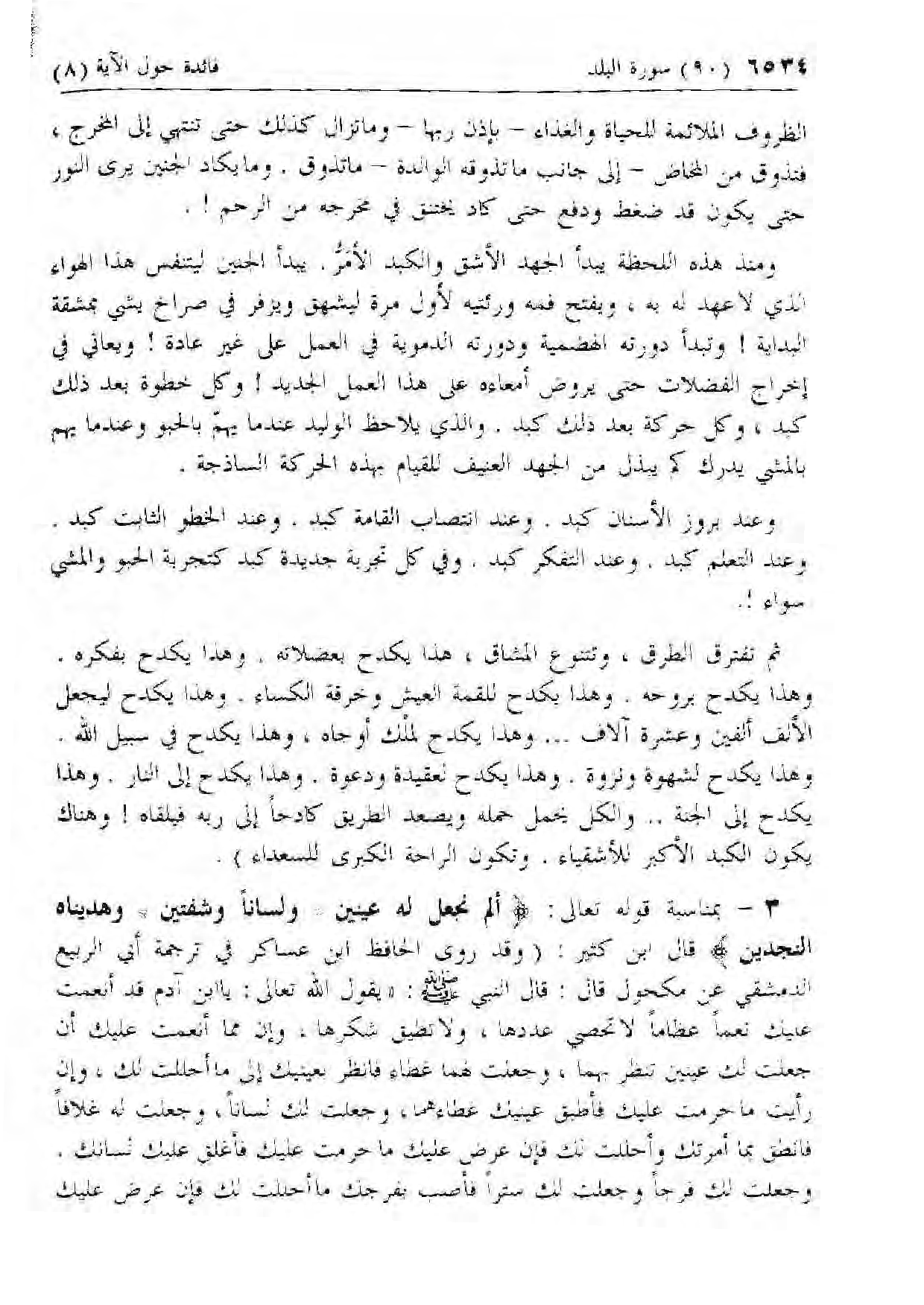 3 - بمناسبة قوله تعالى: أَلَمْ نَجْعَلْ لَهُ عَيْنَيْنِ* وَلِساناً وَشَفَتَيْنِ* وَهَدَيْناهُ النَّجْدَيْنِ قال ابن كثير: (وقد روى الحافظ ابن عساكر في ترجمة أبي الربيع الدمشقي عن مكحول قال: قال النبي صلى الله عليه وسلم: «يقول الله تعالى: يا ابن آدم قد أنعمت عليك نعما عظاما لا تحصي عددها، ولا تطيق شكرها، وإن مما أنعمت عليك أن جعلت لك عينين تنظر بهما، وجعلت لهما غطاء فانظر بعينيك إلى ما أحللت لك، وإن رأيت ما حرمت عليك فأطبق عينيك غطاءهما، وجعلت لك لسانا، وجعلت له غلافا فانطق بما أمرتك وأحللت لك فإن عرض عليك ما حرمت عليك فأغلق عليك لسانك.