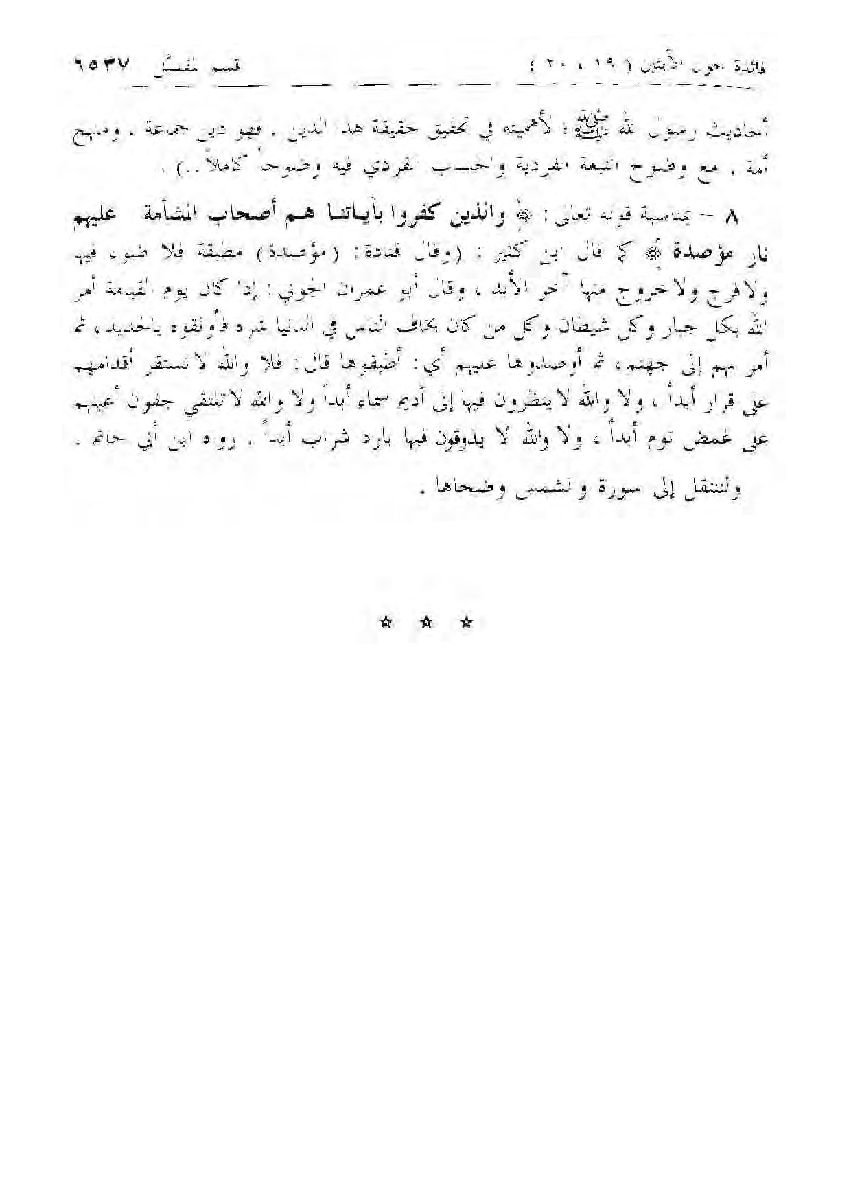 8 - بمناسبة قوله تعالى: وَالَّذِينَ كَفَرُوا بِآياتِنا هُمْ أَصْحابُ الْمَشْأَمَةِ* عَلَيْهِمْ نارٌ مُؤْصَدَةٌ كما قال ابن كثير: (وقال قتادة: (مؤصدة) مطبقة فلا ضوء فيها ولا فرج ولا خروج منها آخر الأبد، وقال أبو عمران الجوني: إذا كان يوم القيامة أمر الله بكل جبار وكل شيطان وكل من كان يخاف الناس في الدنيا شره فأوثقوه بالحديد، ثم أمر بهم إلى جهنم، ثم أوصدوها عليهم أي: أطبقوها قال: فلا والله لا تستقر أقدامهم على قرار أبدا، ولا والله لا ينظرون فيها إلى أديم سماء أبدا ولا والله لا تلتقي جفون أعينهم على غمض نوم أبدا، ولا والله لا يذوقون فيها بارد شراب أبدا. رواه ابن أبي حاتم.
