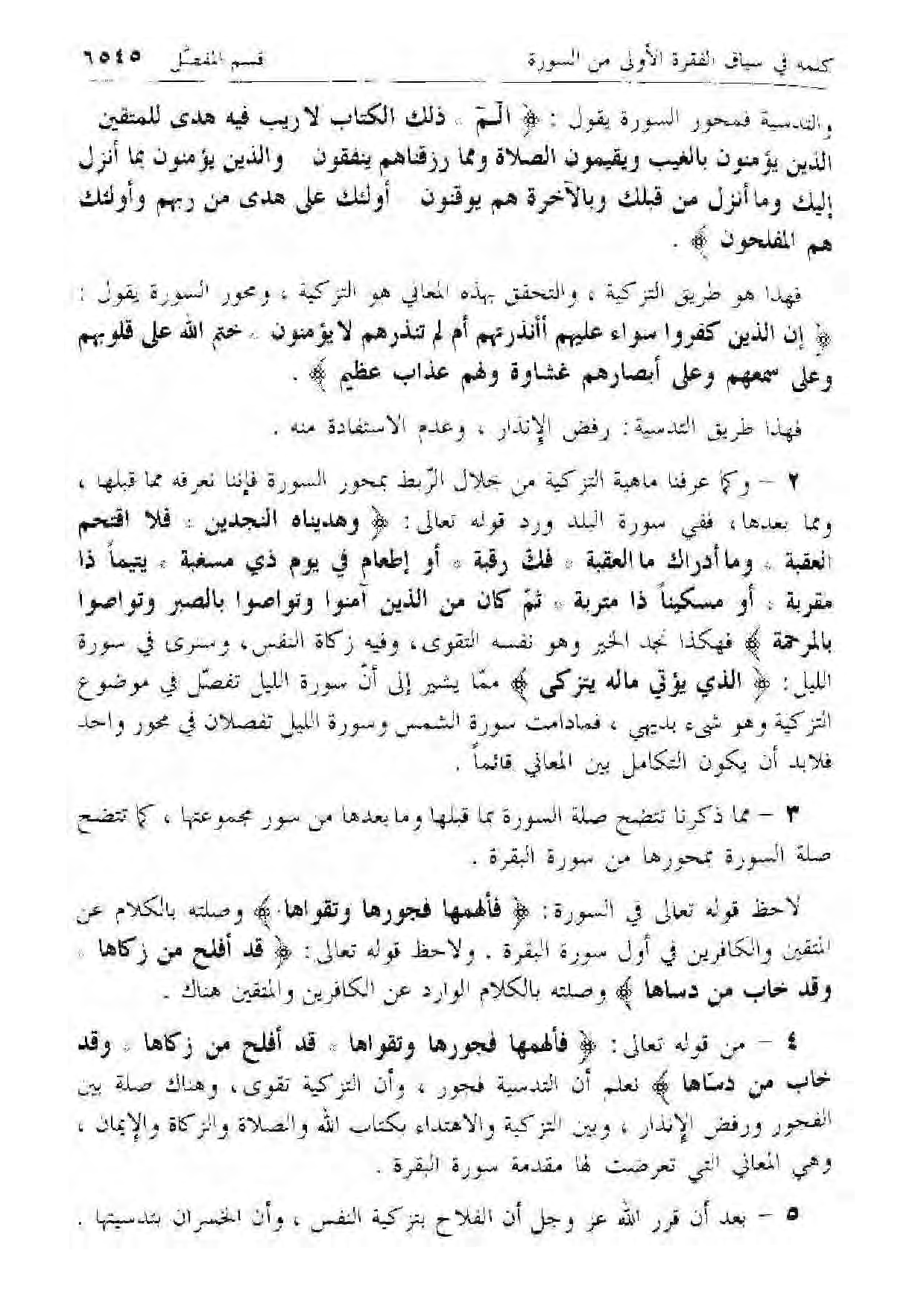 والتدسية فمحور السورة يقول: الم* ذلِكَ الْكِتابُ لا رَيْبَ فِيهِ هُدىً لِلْمُتَّقِينَ* الَّذِينَ يُؤْمِنُونَ بِالْغَيْبِ وَيُقِيمُونَ الصَّلاةَ وَمِمَّا رَزَقْناهُمْ يُنْفِقُونَ* وَالَّذِينَ يُؤْمِنُونَ بِما أُنْزِلَ إِلَيْكَ وَما أُنْزِلَ مِنْ قَبْلِكَ وَبِالْآخِرَةِ هُمْ يُوقِنُونَ* أُولئِكَ عَلى هُدىً مِنْ رَبِّهِمْ وَأُولئِكَ هُمُ الْمُفْلِحُونَ.
