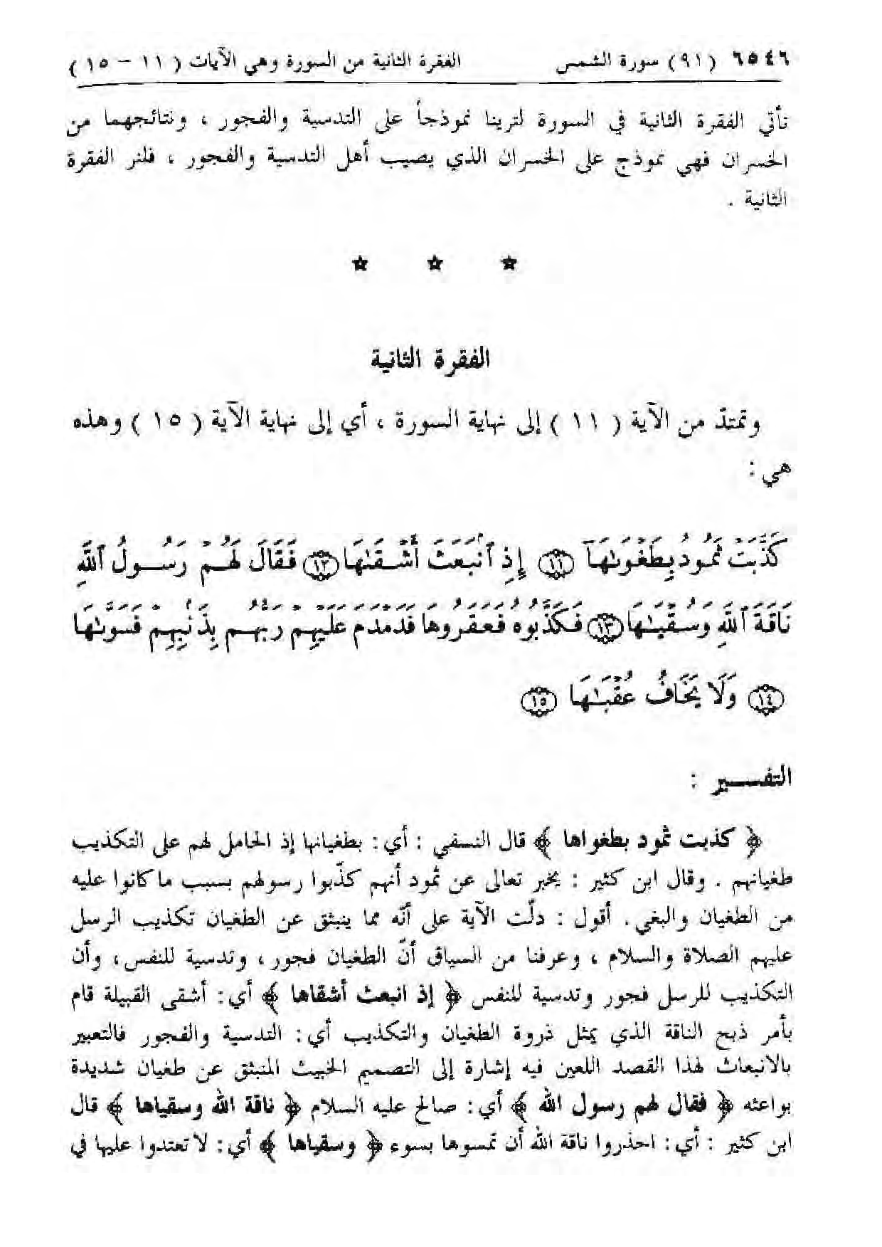 كَذَّبَتْ ثَمُودُ بِطَغْواها (11) إِذِ انْبَعَثَ أَشْقاها (12) فَقالَ لَهُمْ رَسُولُ اللَّهِ ناقَةَ اللَّهِ وَسُقْياها (13) فَكَذَّبُوهُ فَعَقَرُوها فَدَمْدَمَ عَلَيْهِمْ رَبُّهُمْ بِذَنْبِهِمْ فَسَوَّاها (14) وَلا يَخافُ عُقْباها (15)