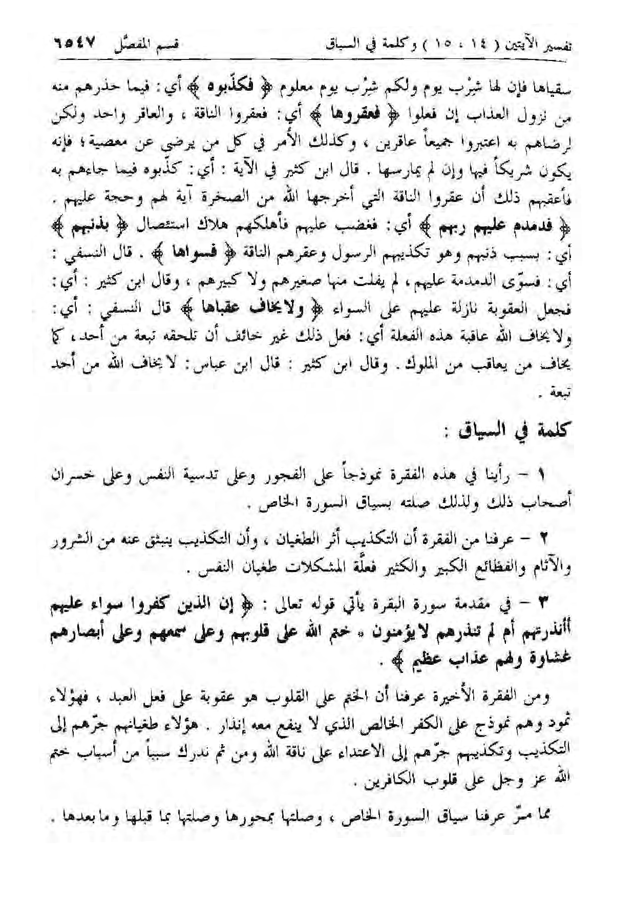 1 - رأينا في هذه الفقرة نموذجا على الفجور وعلى تدسية النفس وعلى خسران أصحاب ذلك ولذلك صلته بسياق السورة الخاص.