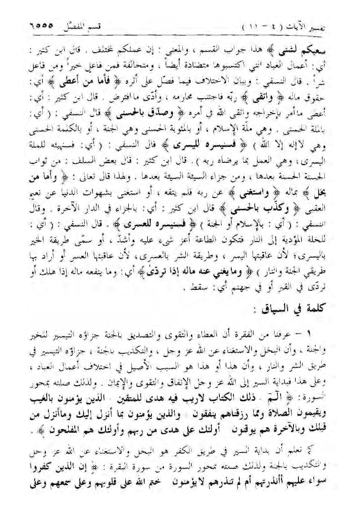 1 - عرفنا من الفقرة أن العطاء والتقوى والتصديق بالجنة جزاؤه التيسير للخير والجنة، وأن البخل والاستغناء عن الله عزّ وجل، والتكذيب بالجنة، جزاؤه التيسير في طريق الشر والنار، وأن هذا أو هذا هو السبب الأصيل في اختلاف أعمال العباد، وعلى هذا فبداية السير إلى الله عزّ وجل الإنفاق والتقوى والإيمان. ولذلك صلته بمحور السورة: الم* ذلِكَ الْكِتابُ لا رَيْبَ فِيهِ هُدىً لِلْمُتَّقِينَ* الَّذِينَ يُؤْمِنُونَ بِالْغَيْبِ وَيُقِيمُونَ الصَّلاةَ وَمِمَّا رَزَقْناهُمْ يُنْفِقُونَ* وَالَّذِينَ يُؤْمِنُونَ بِما أُنْزِلَ إِلَيْكَ وَما أُنْزِلَ مِنْ قَبْلِكَ وَبِالْآخِرَةِ هُمْ يُوقِنُونَ* أُولئِكَ عَلى هُدىً مِنْ رَبِّهِمْ وَأُولئِكَ هُمُ الْمُفْلِحُونَ.